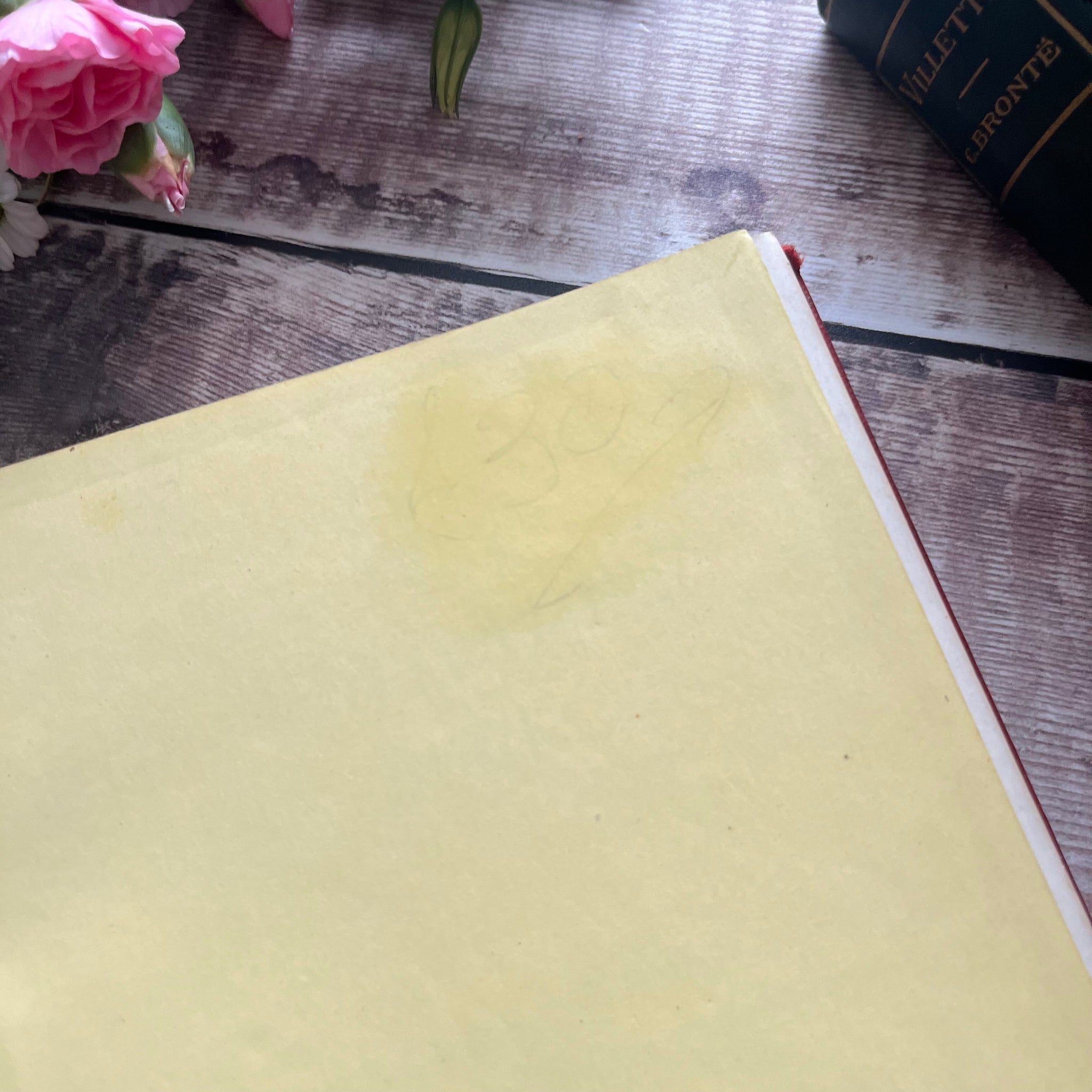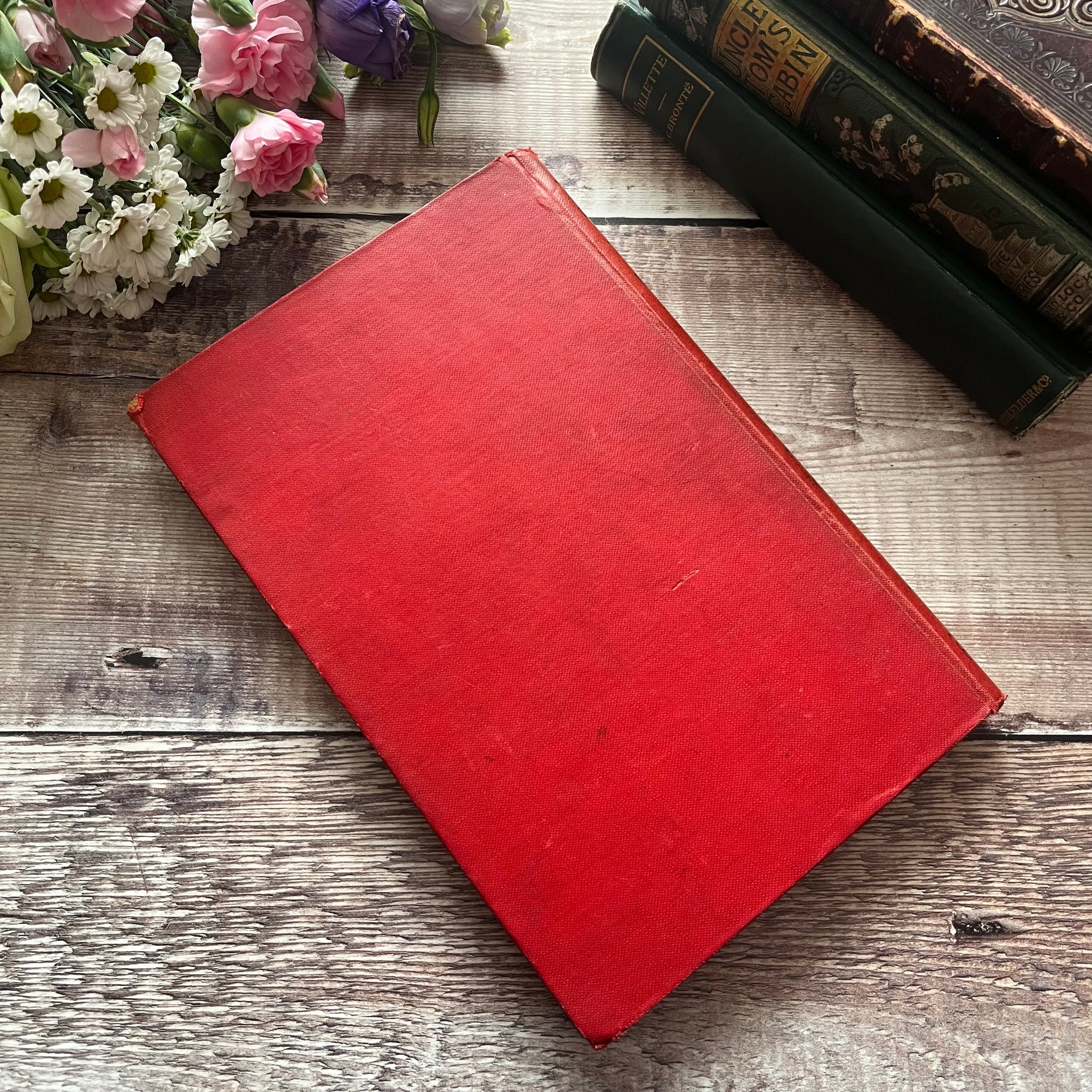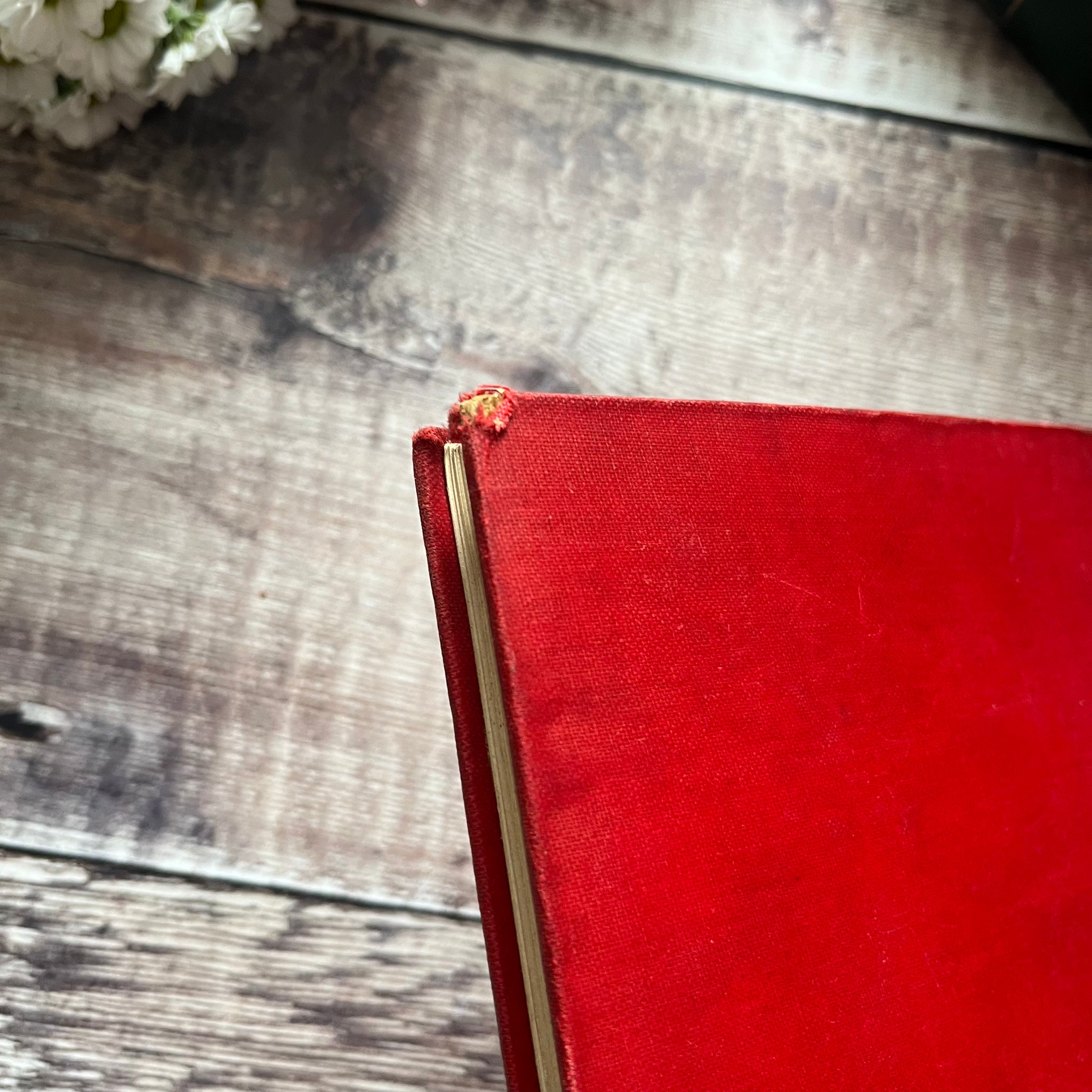The book is bound in red cloth with pretty floral decoration to the front board and gilt lettering. It's in good condition for it's age but the boards do show some marking and light soiling. There is wear to the corners and a little fraying to the cloth at the top corners. The board edges are bumped and the spine is faintly sunned. Crushing to the spine ends has caused splitting in the cloth - there is a small hole in the cloth at the edge of the front board near the tail of the spine.