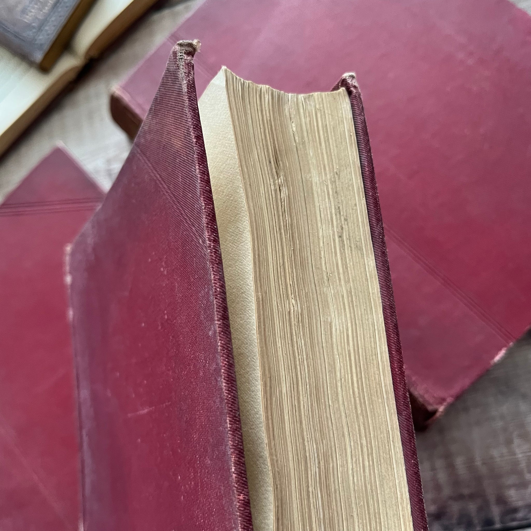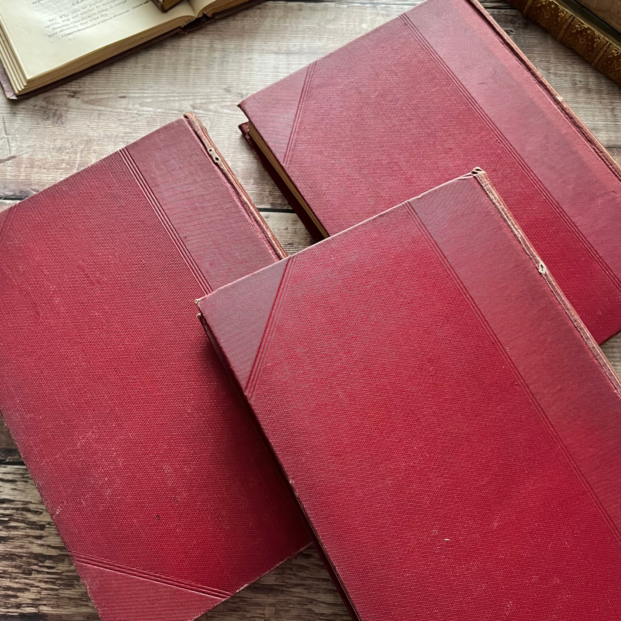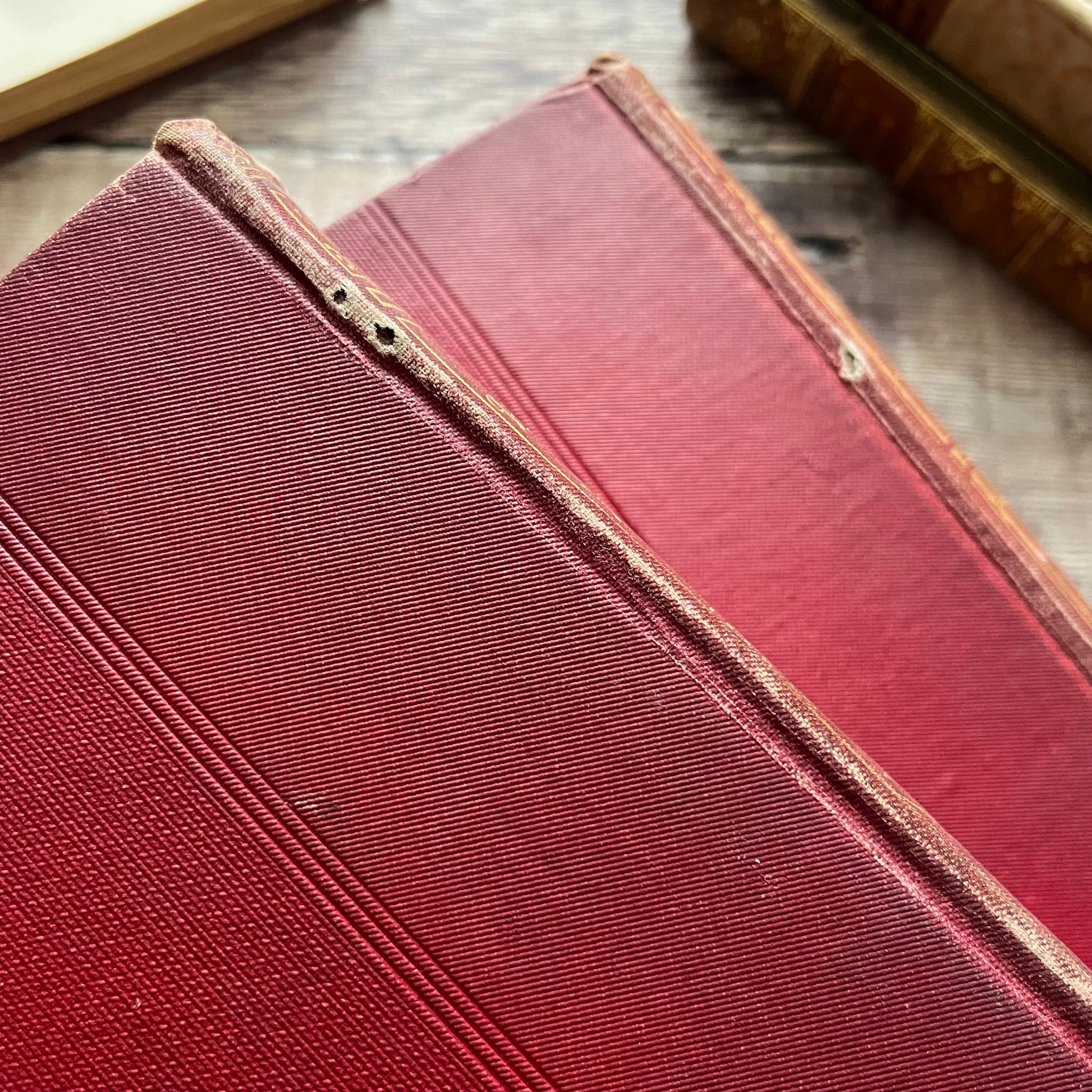 The books are uniformly bound in red cloth with gilt decoration to the spines. They're in good condition for their age but there is wear and crushing to the corners, with some minor fraying to the cloth. There is rubbing to the board edges and some small chips in the cloth. The boards are marked and soiled; volume one has bowing to the boards. The spines are lightly sunned and marked, with rubbing to the spine edges. Crushing to the spine ends has caused very minor splitting in the cloth.
