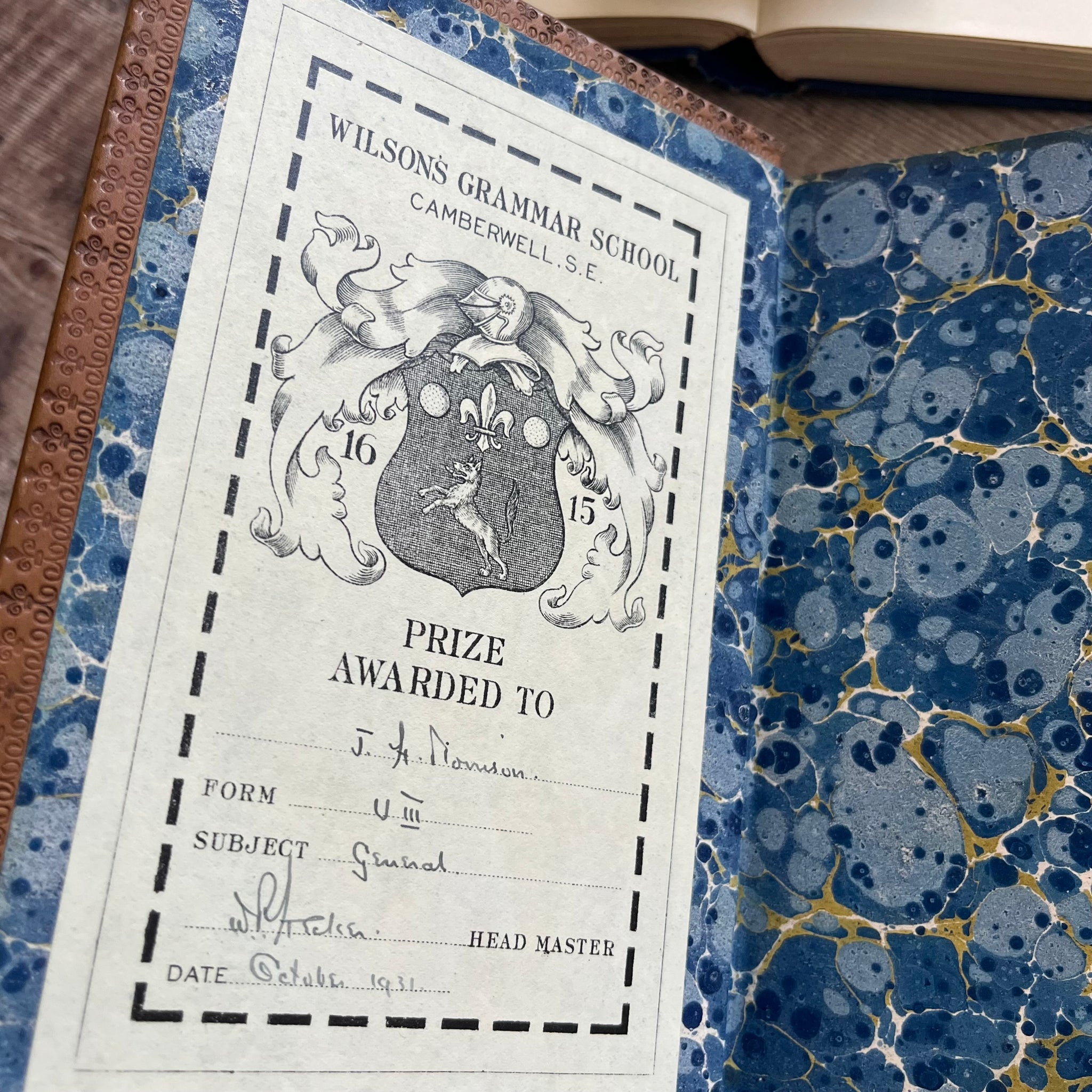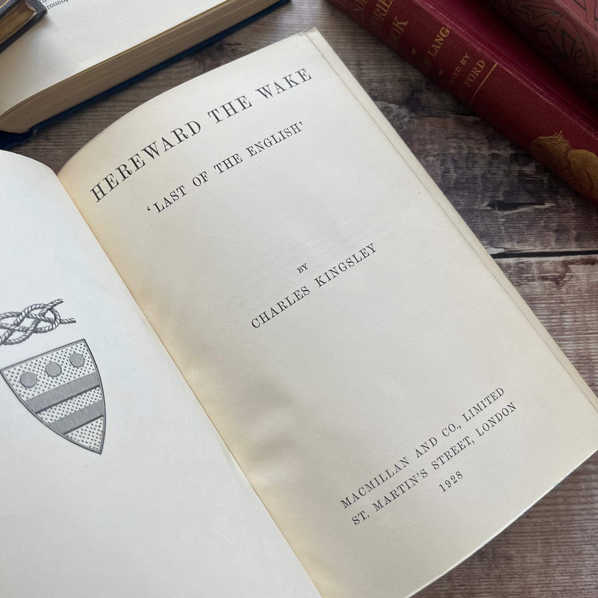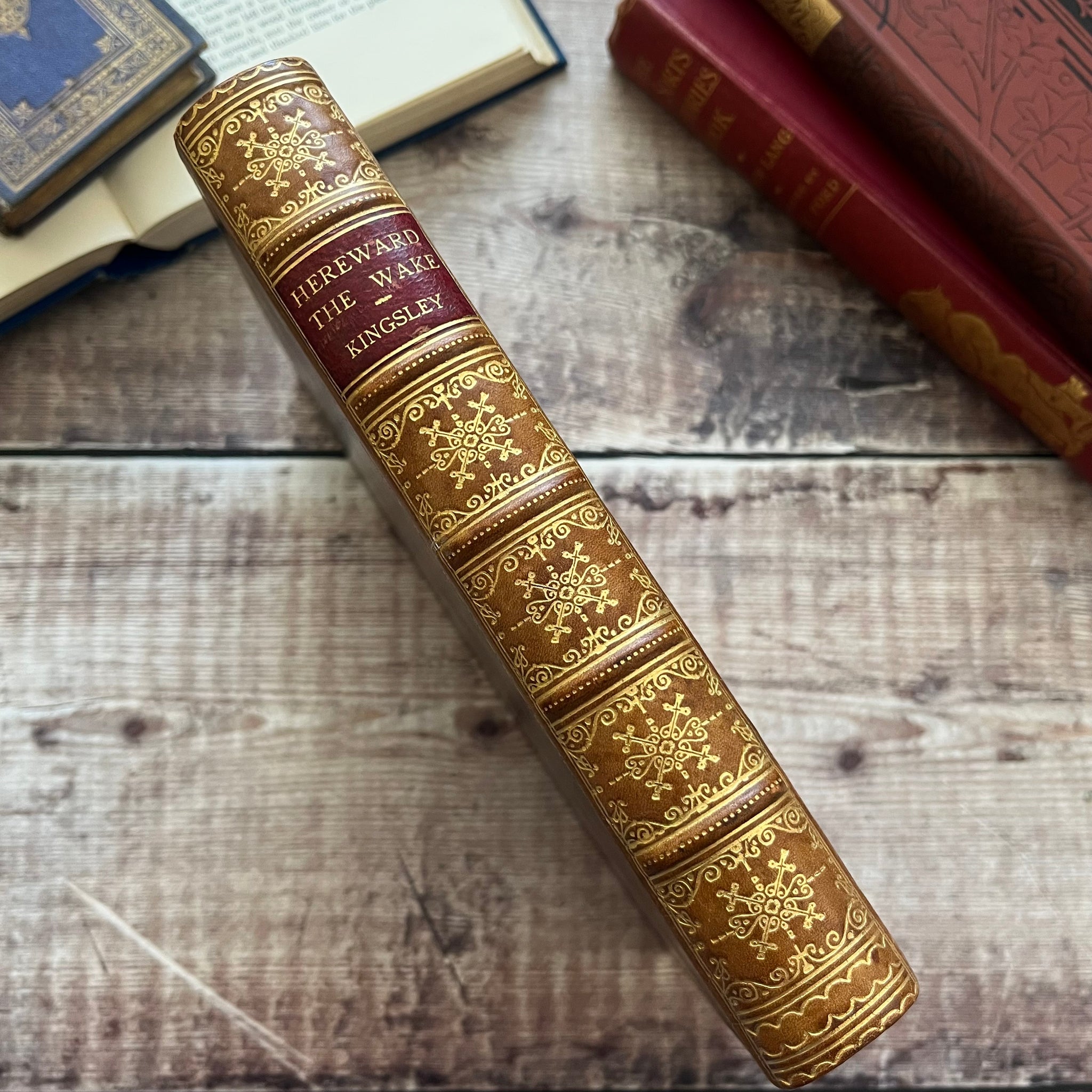 This lovely edition of Hereward the Wake by Charles Kingsley was published by London Macmillan and Co in 1928. It's a stunning school prize binding, bound in full tree calf leather, with marbling to the text block edges. There is a striking school insignia blind stamped into the front board in gilt - the knight's helmet is particularly eye catching - and the spine features five raised bands and gilt tooling.