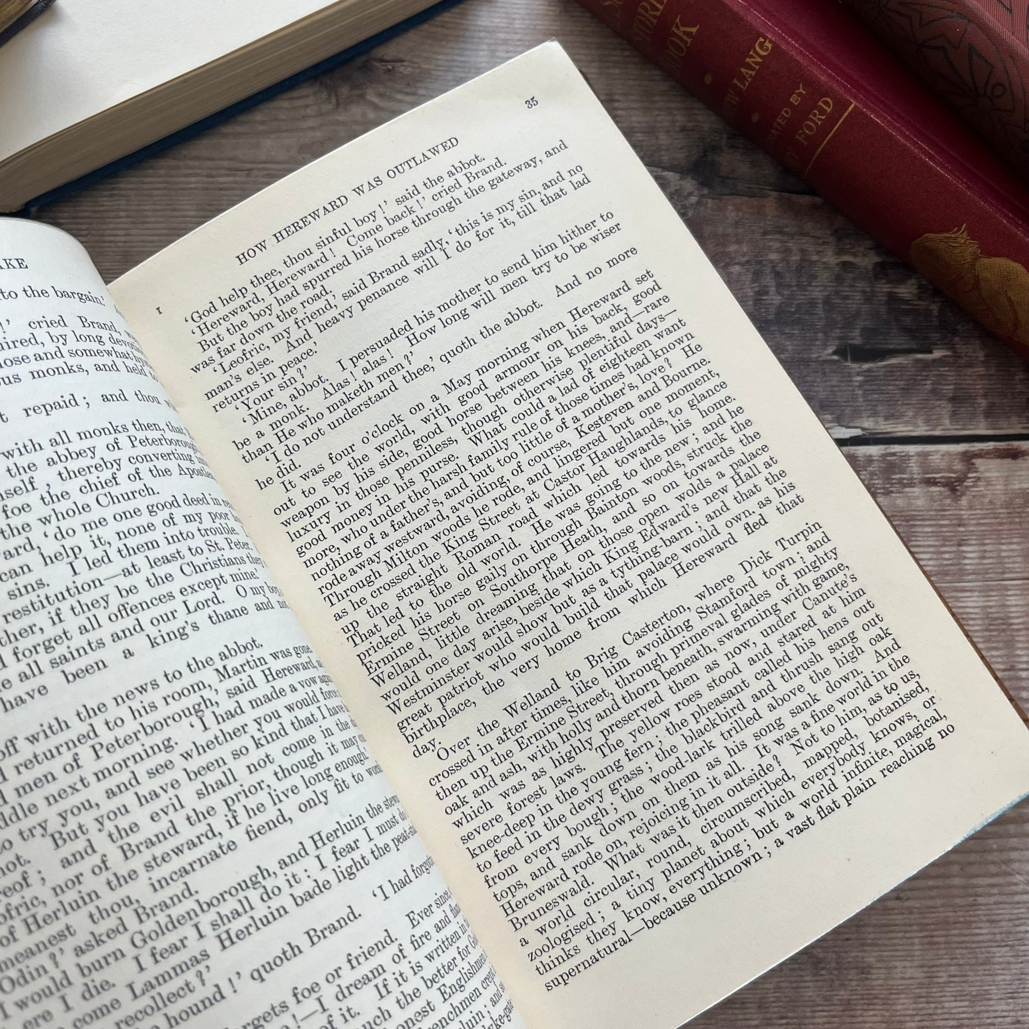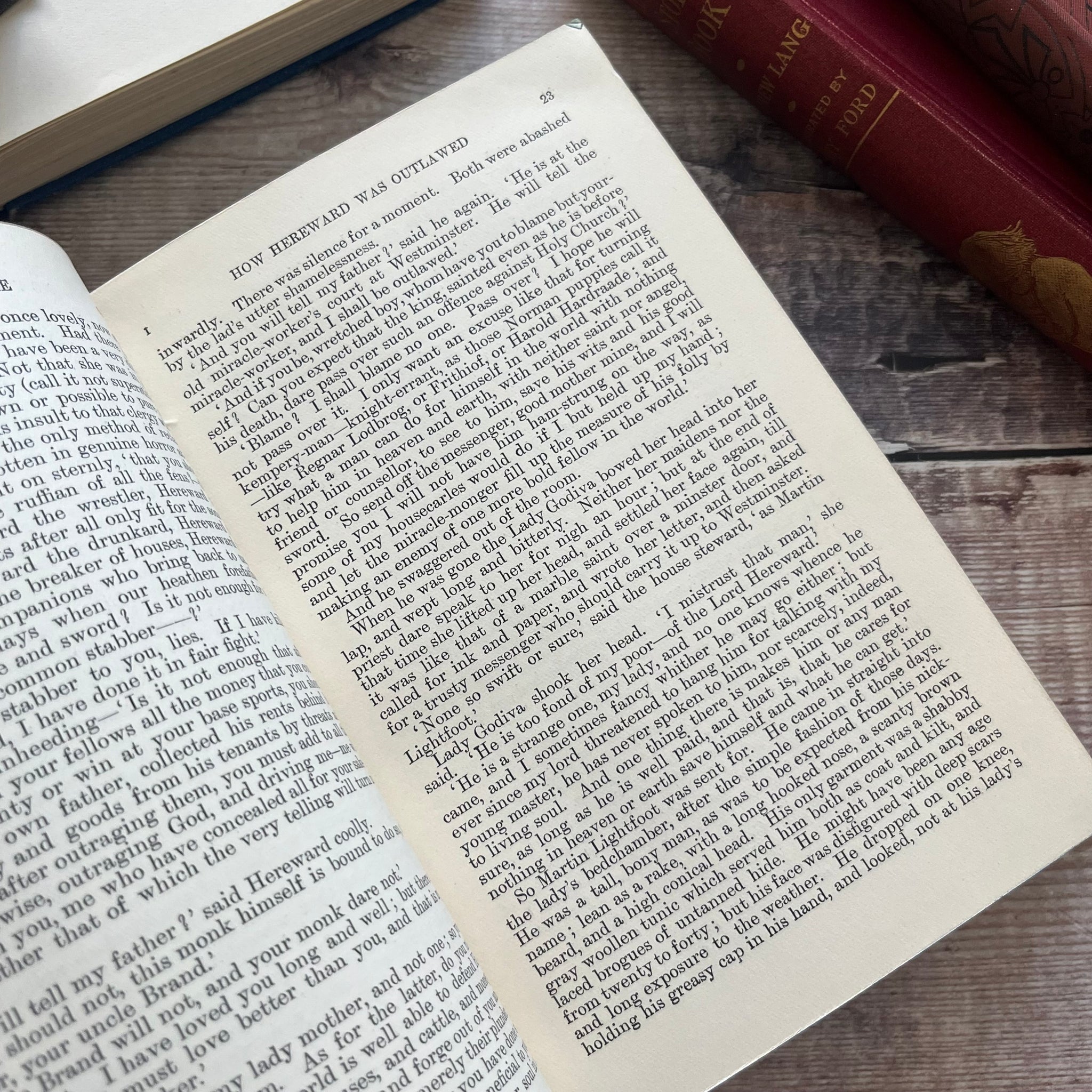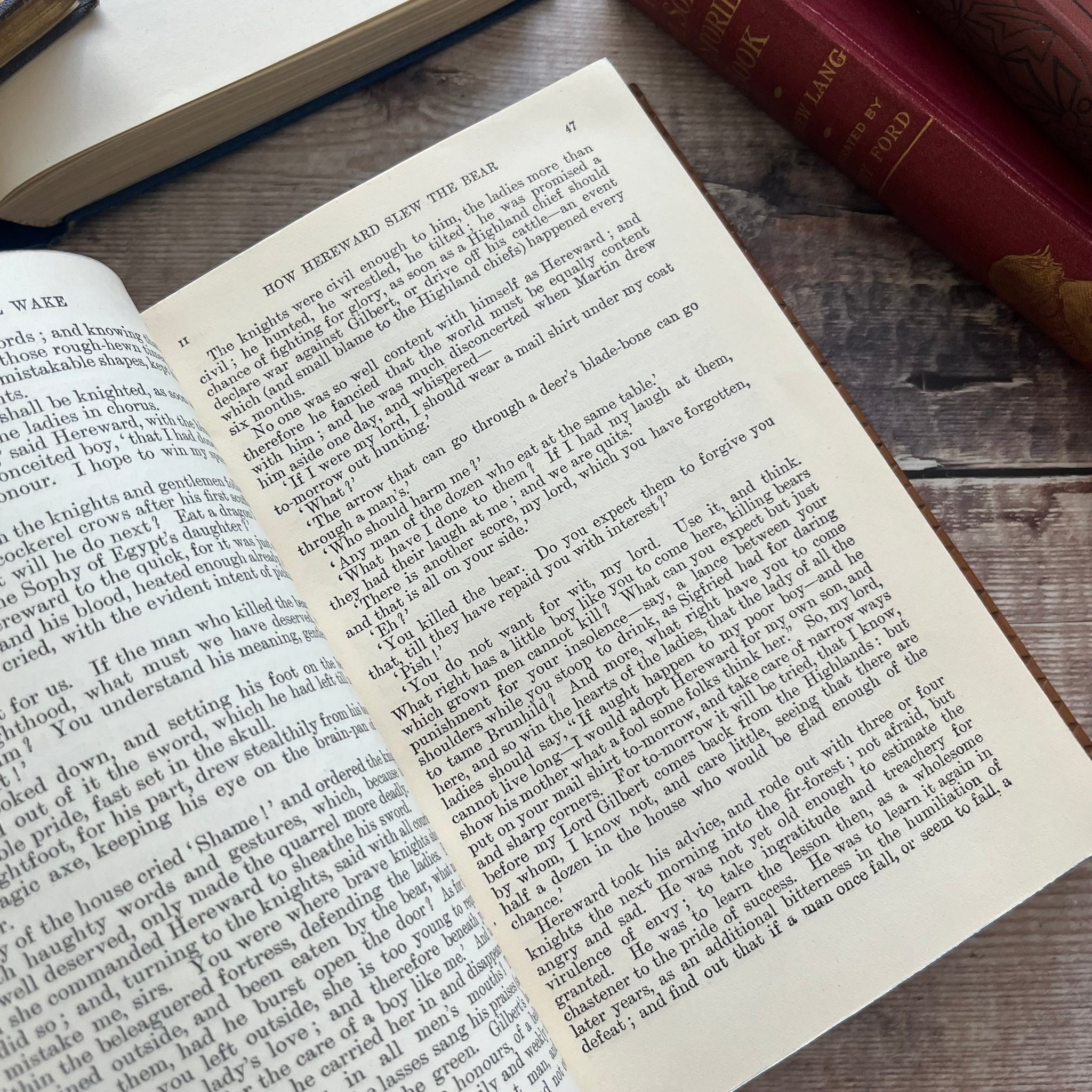 This lovely edition of Hereward the Wake by Charles Kingsley was published by London Macmillan and Co in 1928. It's a stunning school prize binding, bound in full tree calf leather, with marbling to the text block edges. There is a striking school insignia blind stamped into the front board in gilt - the knight's helmet is particularly eye catching - and the spine features five raised bands and gilt tooling.