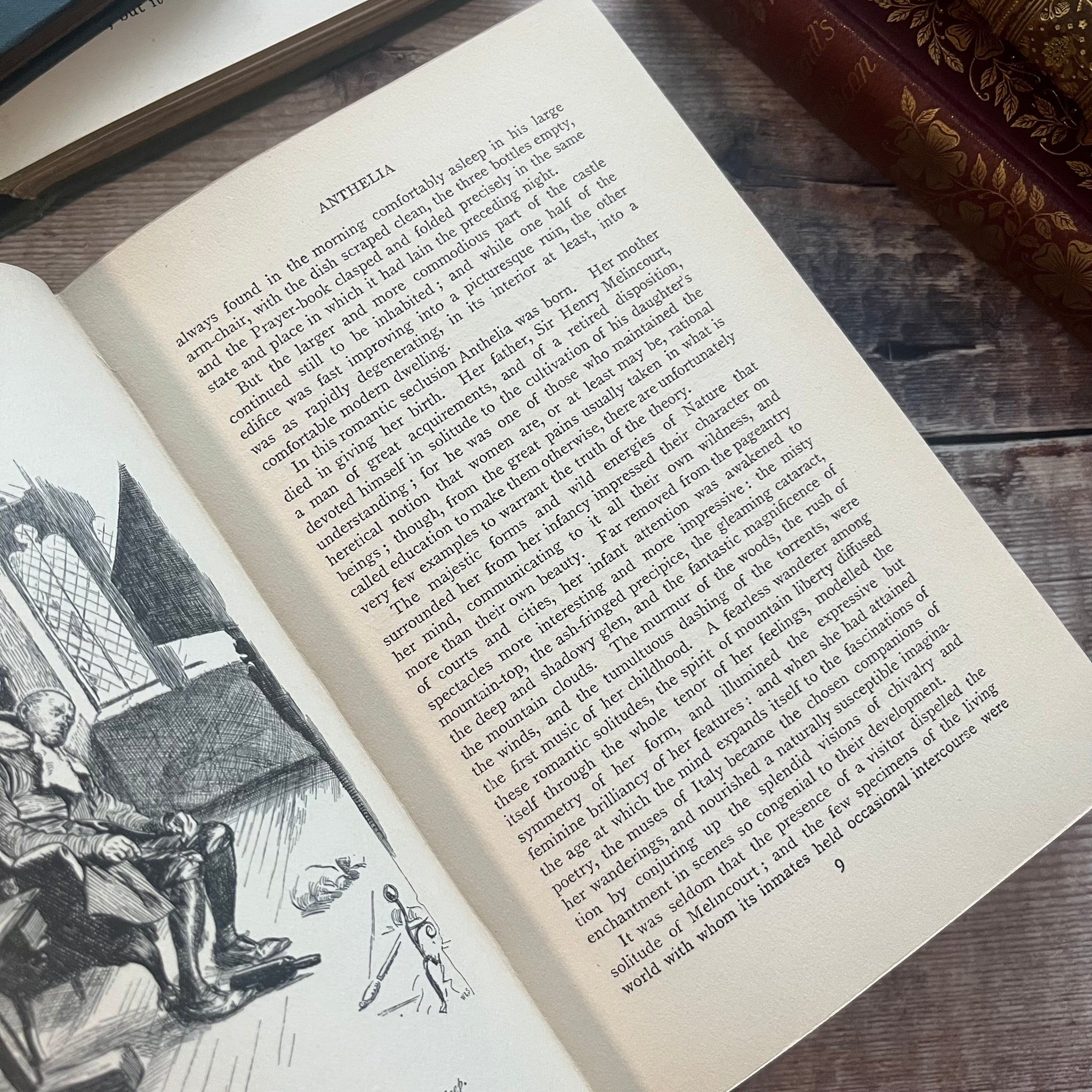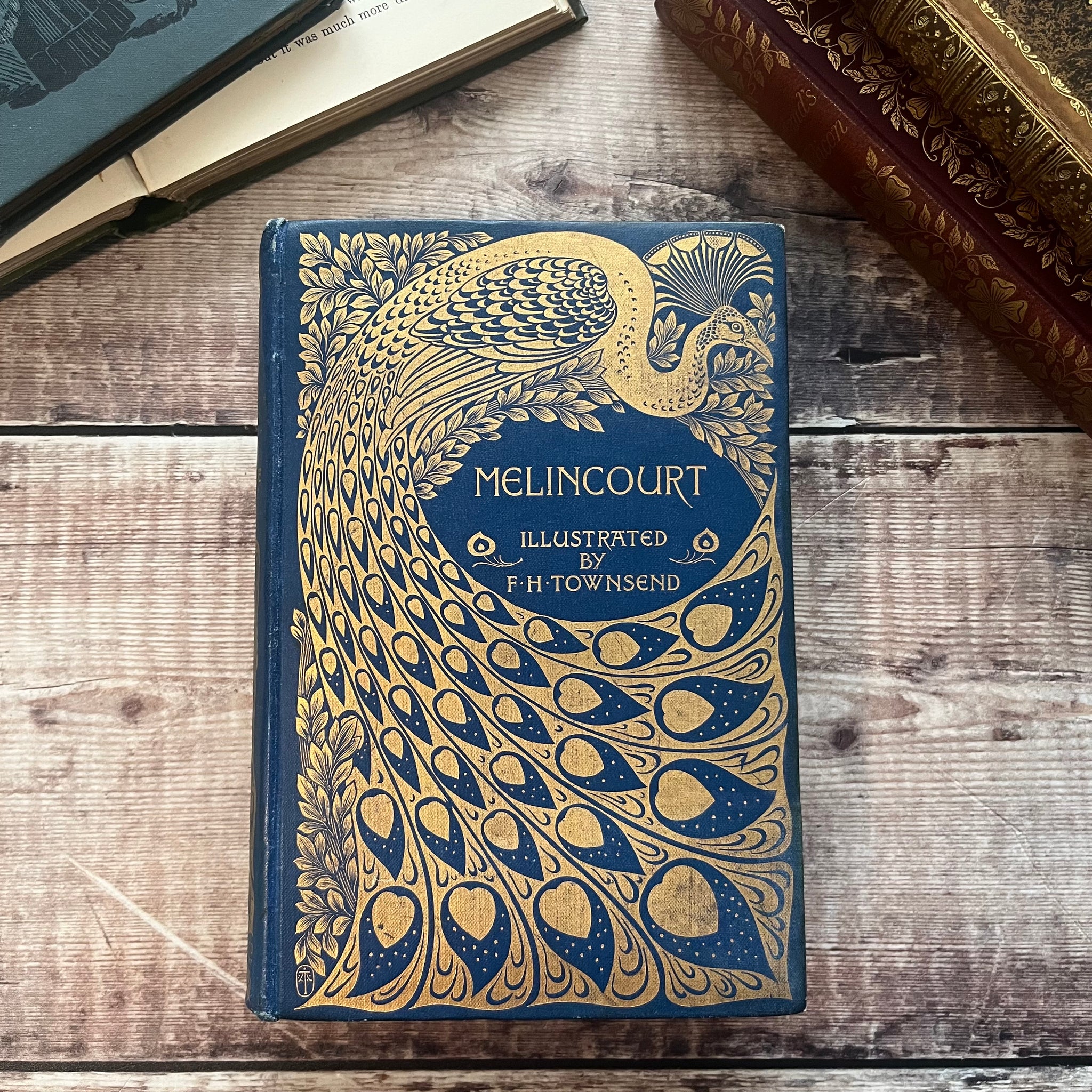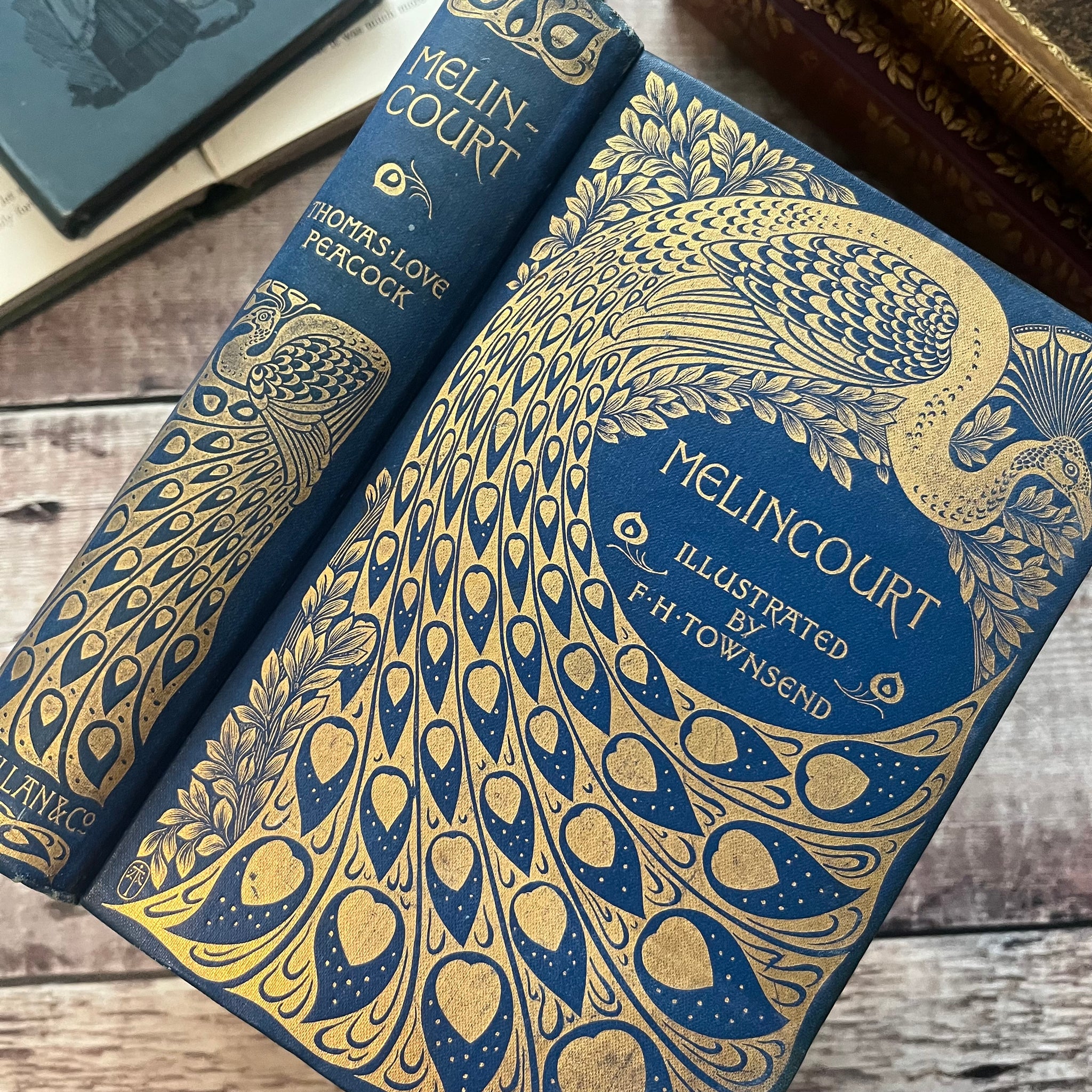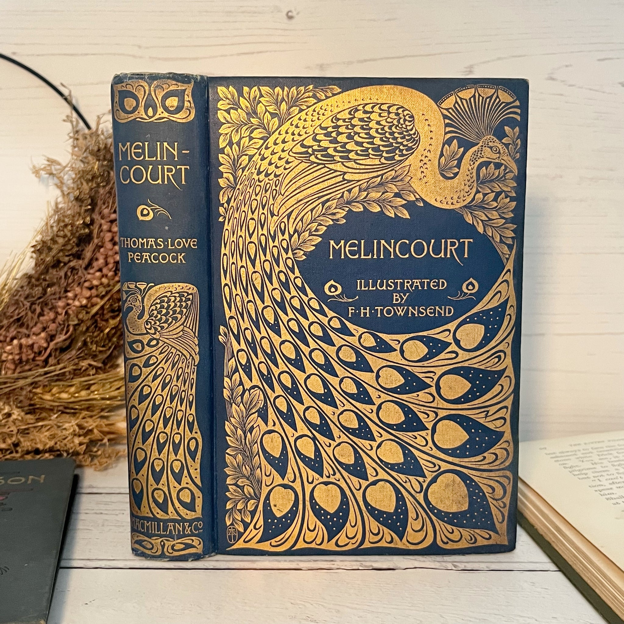 This stunning and rare antique edition of Melincourt by Thomas Love Peacock features the beautiful and iconic AA Turbayne designed binding of a stylized peacock. This extraordinary art nouveau design includes Turbayne's signature - the small AT initials in the bottom left corner. Albert Angus Turbayne created stunning book cover designs in the late 19th Century, towards the end of the Victorian era.
