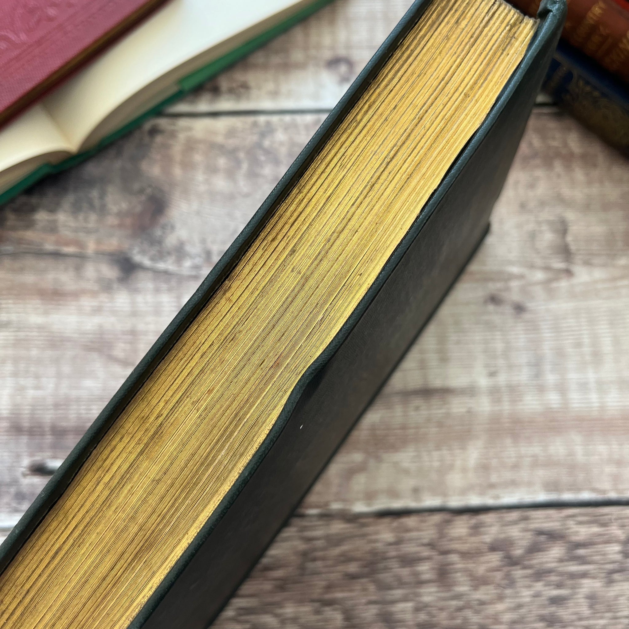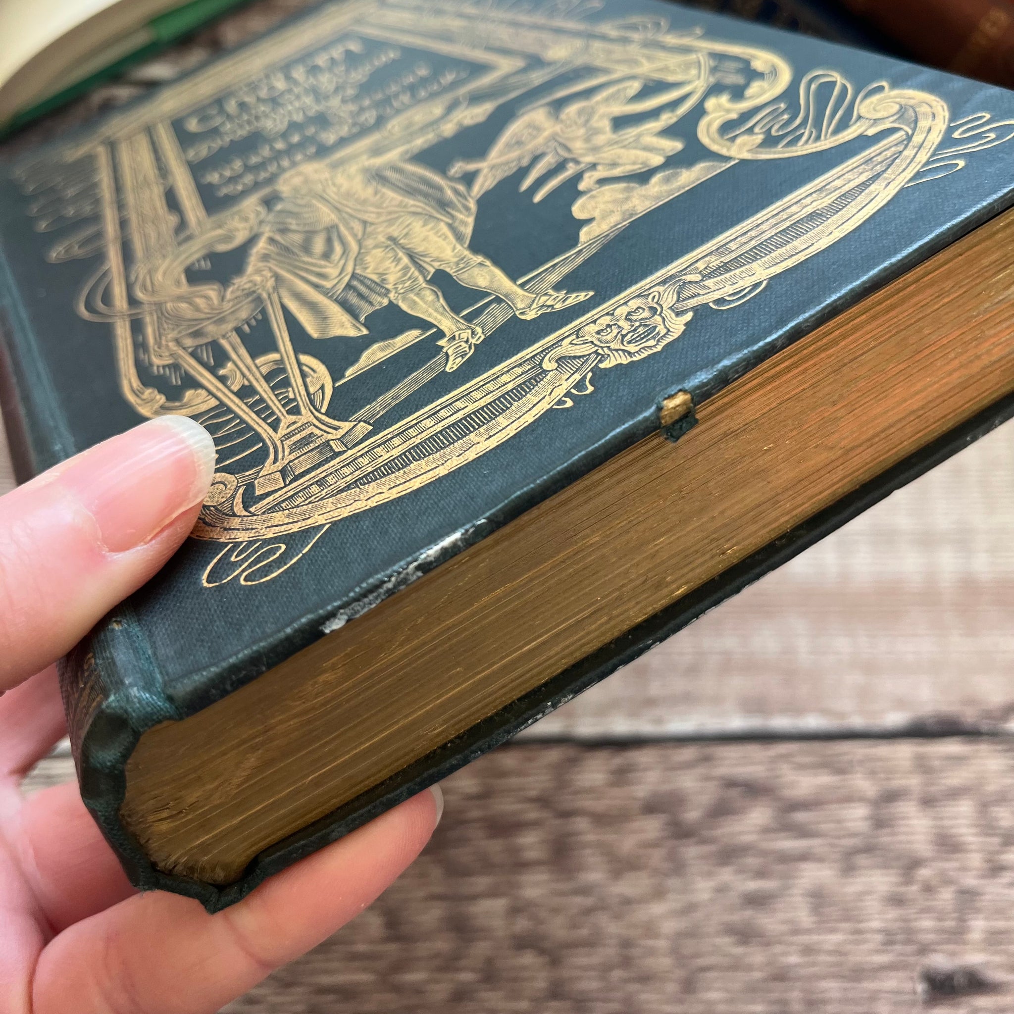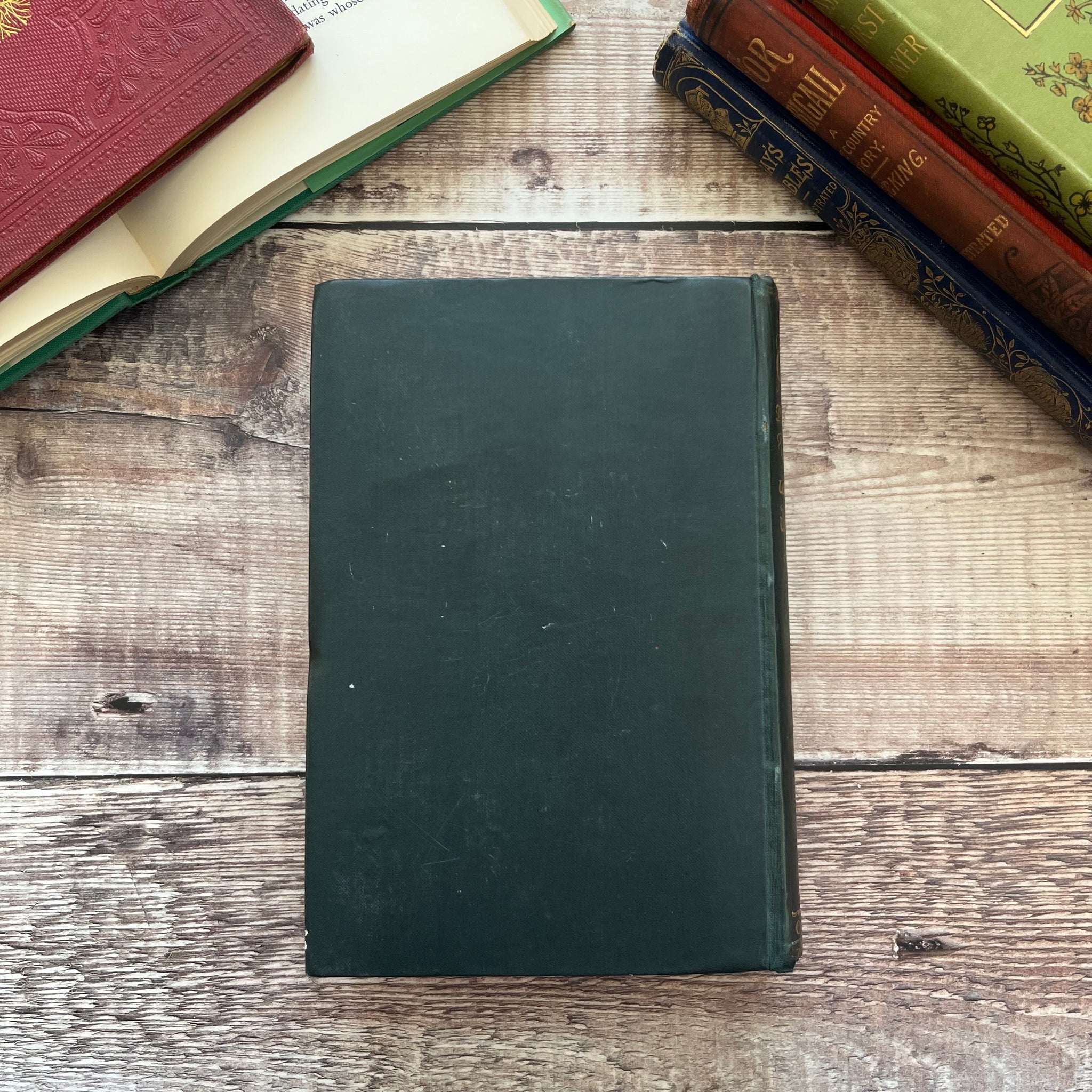 The book is bound in teal cloth with intricate gilt detail to the front board and spine. It's in good condition for it's age but there is some marking to the bottom edges of the boards, and a small chip in the cloth at the bottom edge of the front board. The corners show light wear and there is a dent to the edge of the back board. There is minor marking to the back board and a little rubbing/dulling to the gilt on the spine. Crushing to the spine ends has caused minor splitting in the cloth, and there is a tiny hole to the external back joint.