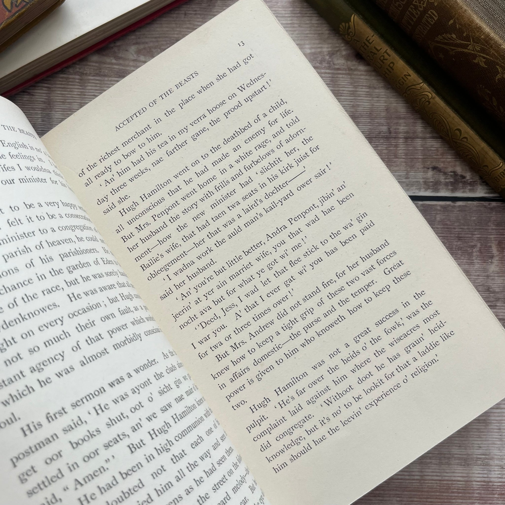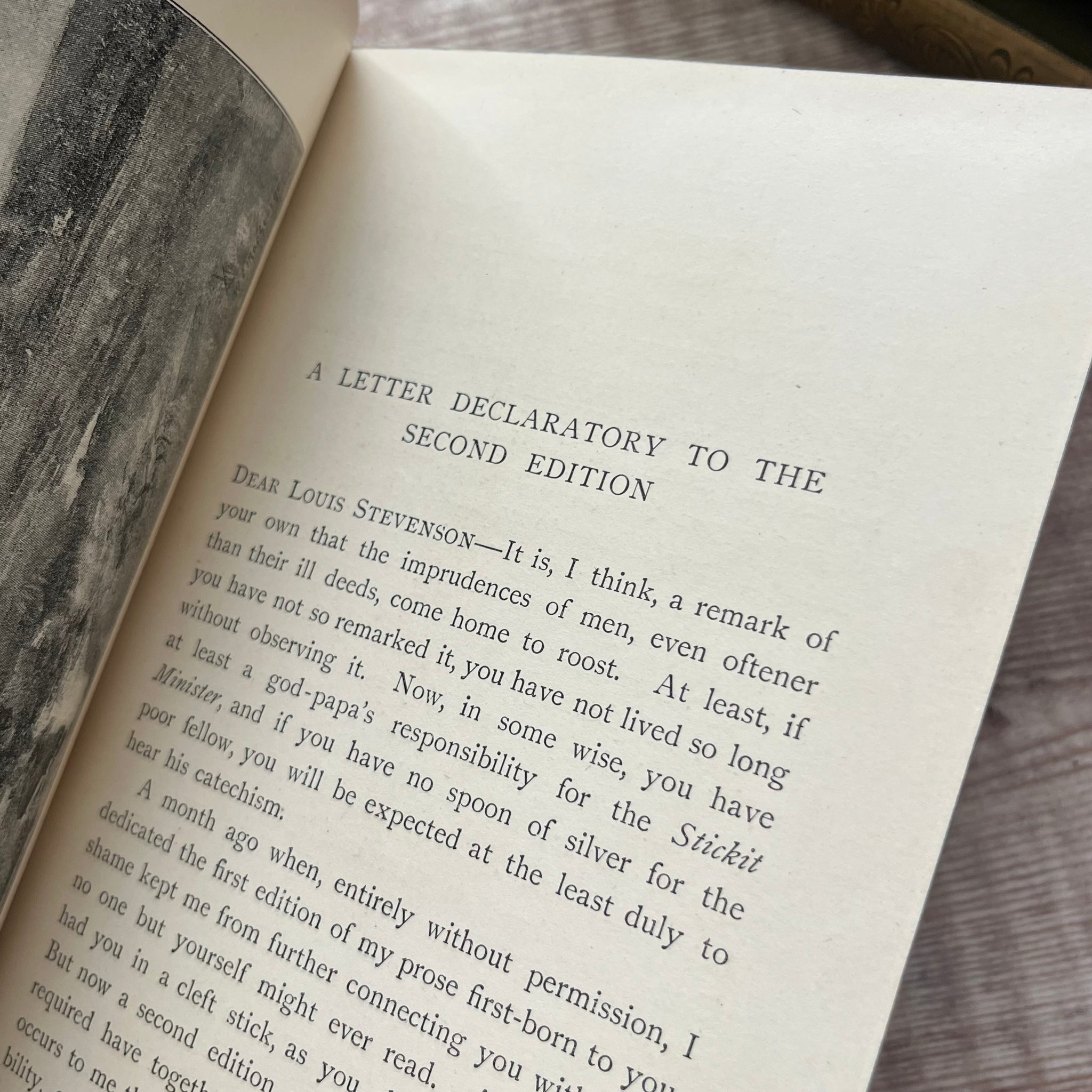 This stunning antique edition of The Stickit Minister and Some Common Men by S R Crockett was published by Fisher Unwin in 1895. So the book is from the late Victorian era but the binding is more contemporary - the book is bound in half calf leather with blue cloth boards. The spine features three raised bands and gilt tooling and the text block edges are marbled. Someone obviously decided to get the book rebound for their personal library.