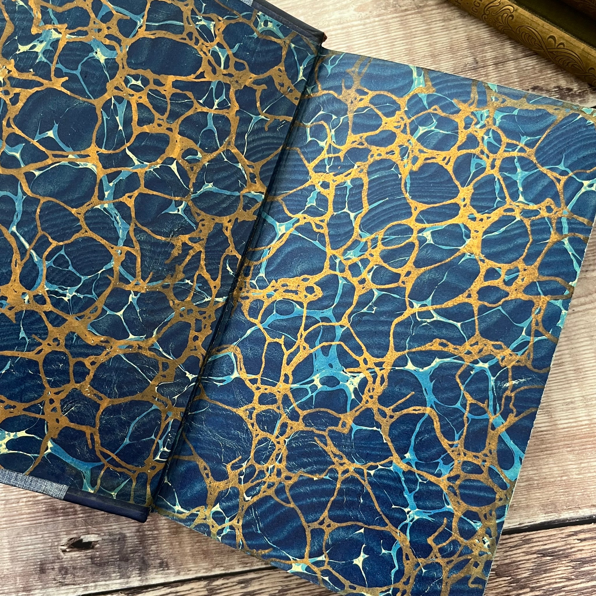 Inside, the endpapers are marbled to match the edges of the text block. The pages are clean and bright with only light age toning and occasional foxing.