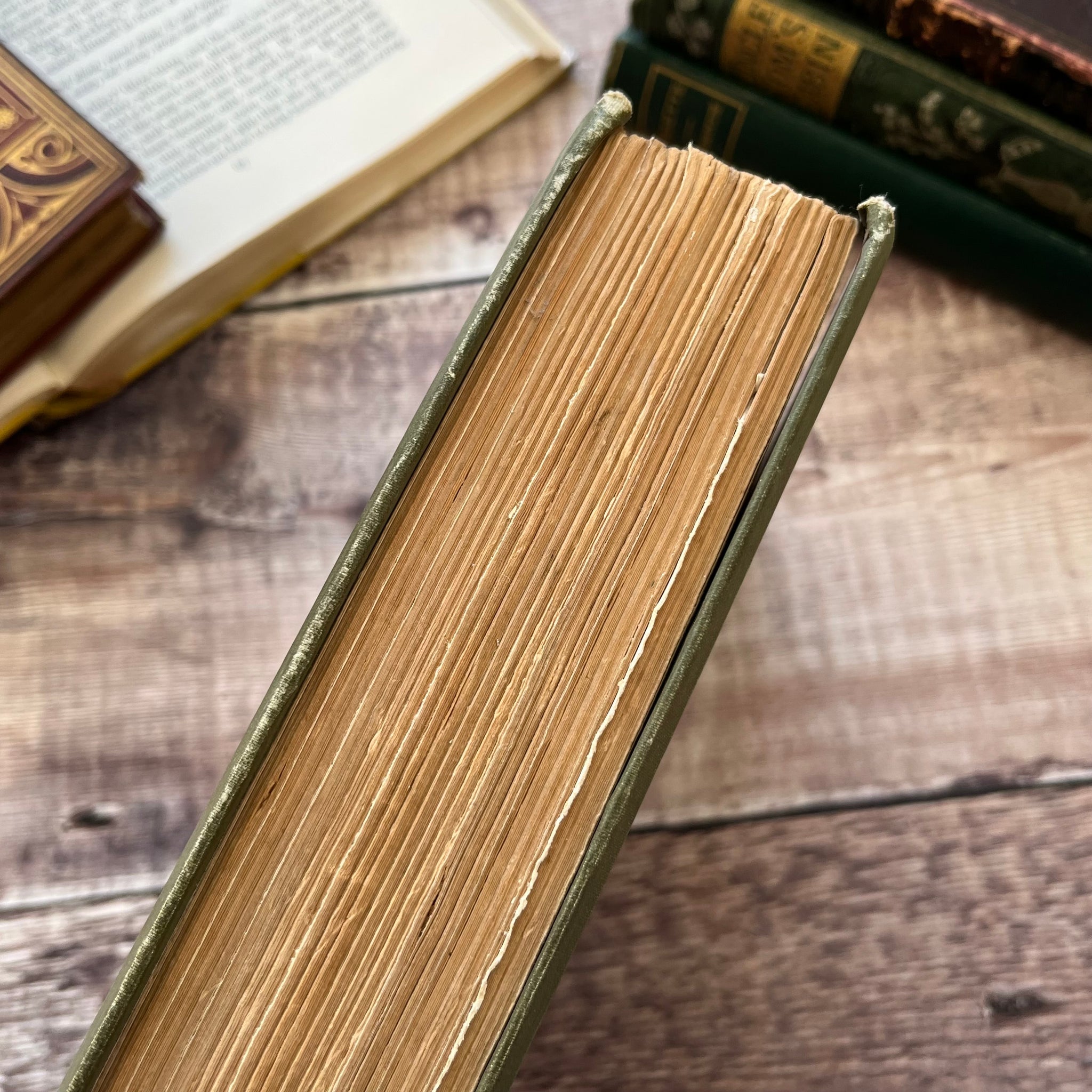 The book is bound in green cloth with stunning pictorial decoration to the front board and gilt to the spine. The decoration has quite an art nouveau feel to it. The book is in good condition for it's age but there is wear to the corners, and the board edges are lightly rubbed and bumped. The boards have some minor marks and scuffs, and there is a little loss to the front decoration. The spine edges are rubbed and a dent to the spine has caused a small split in the cloth. There is crushing to the spine ends which has caused minor splitting in the cloth.