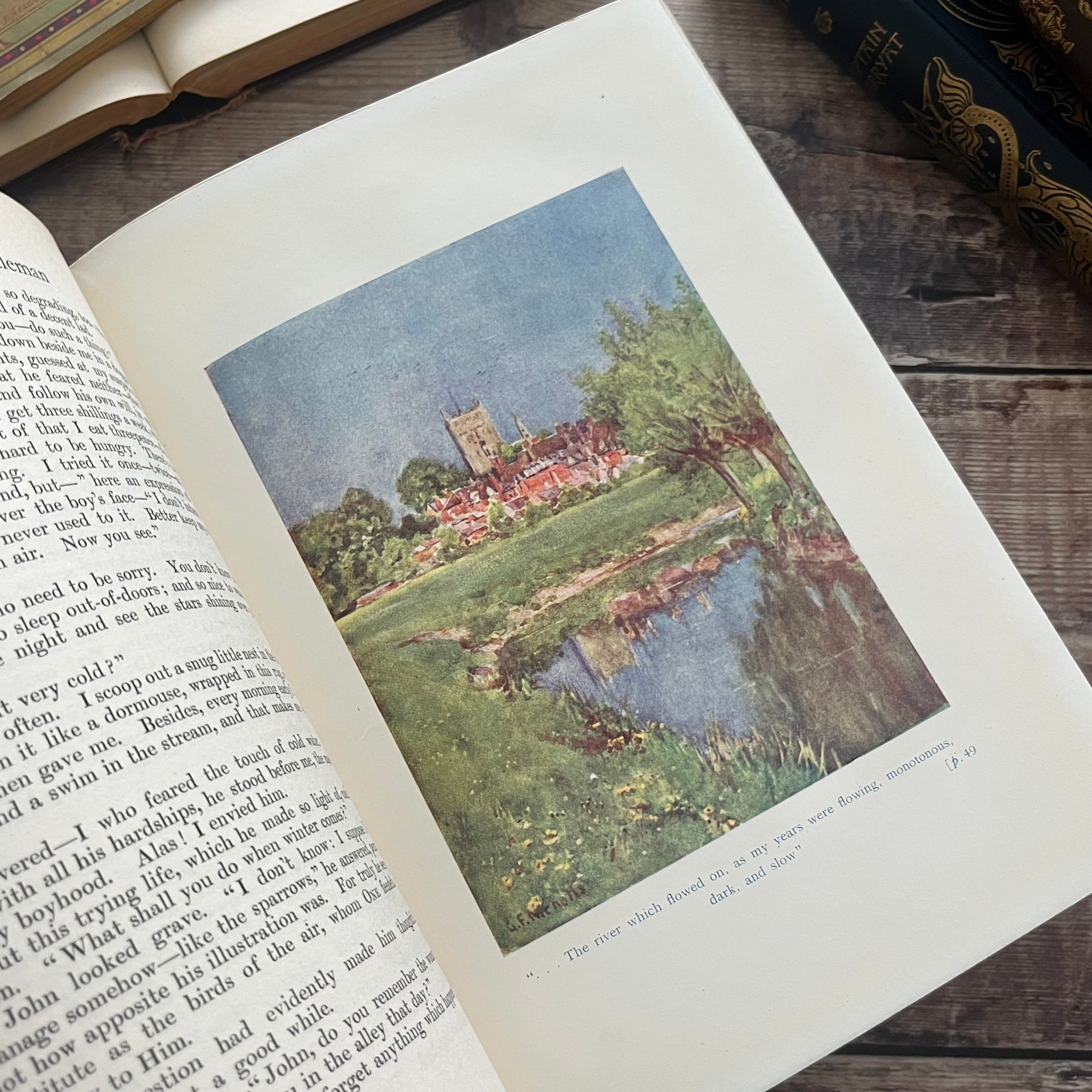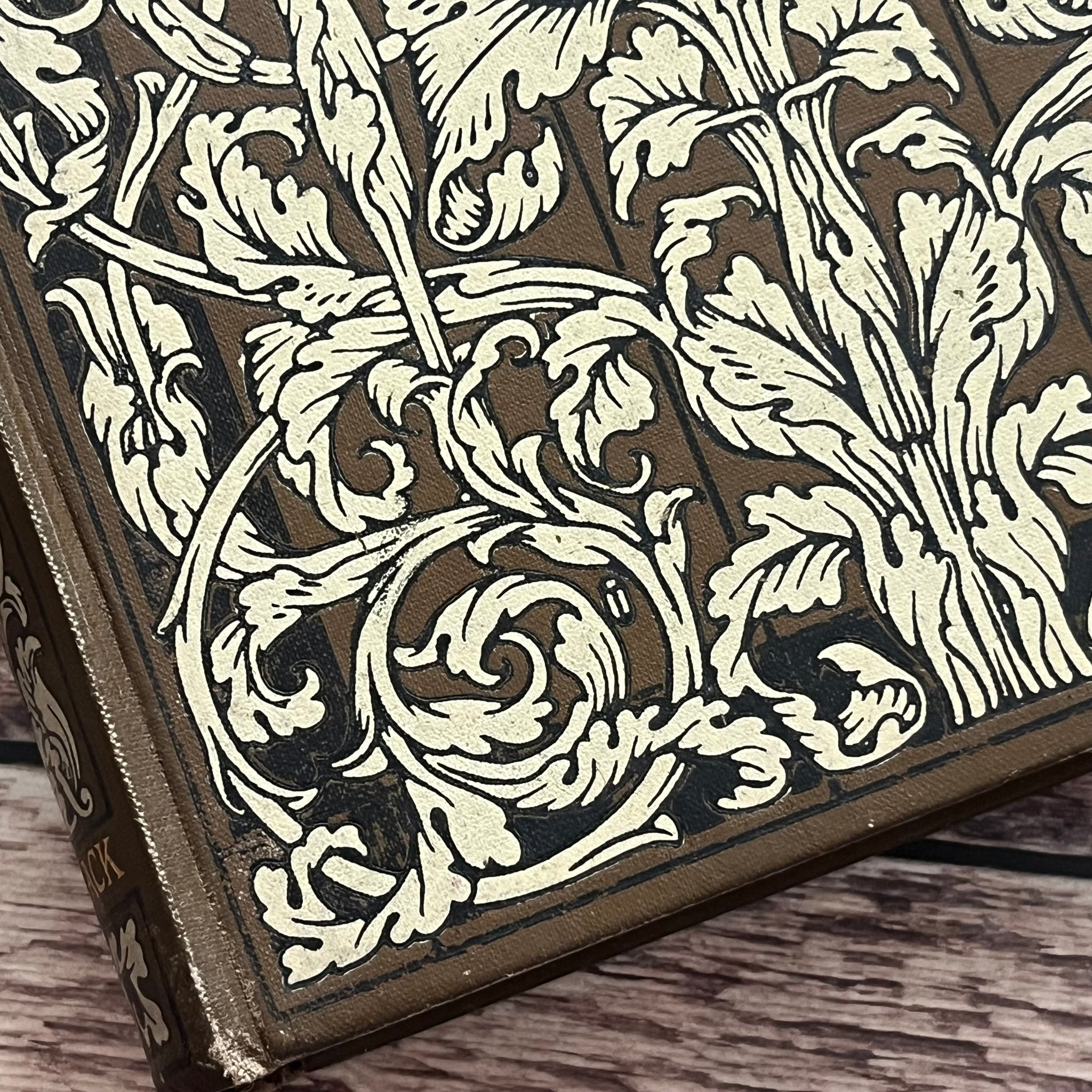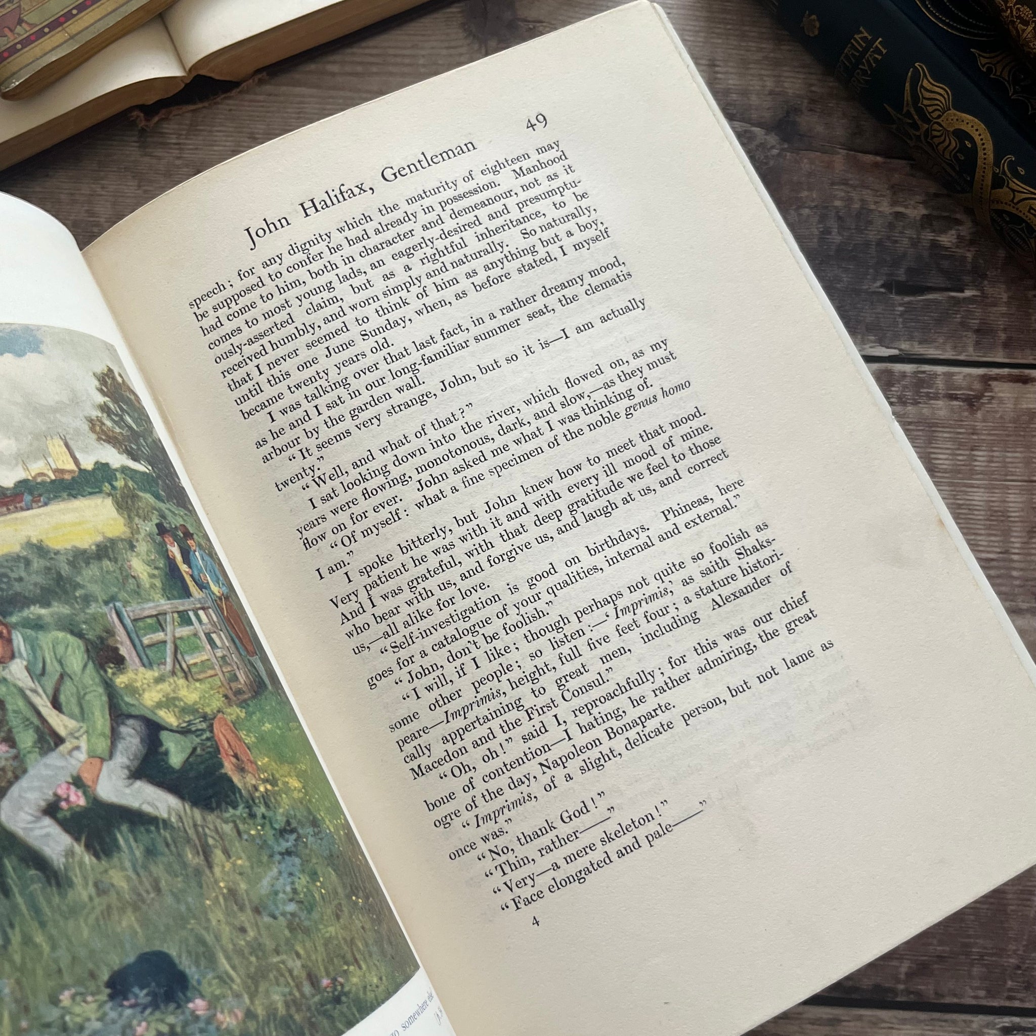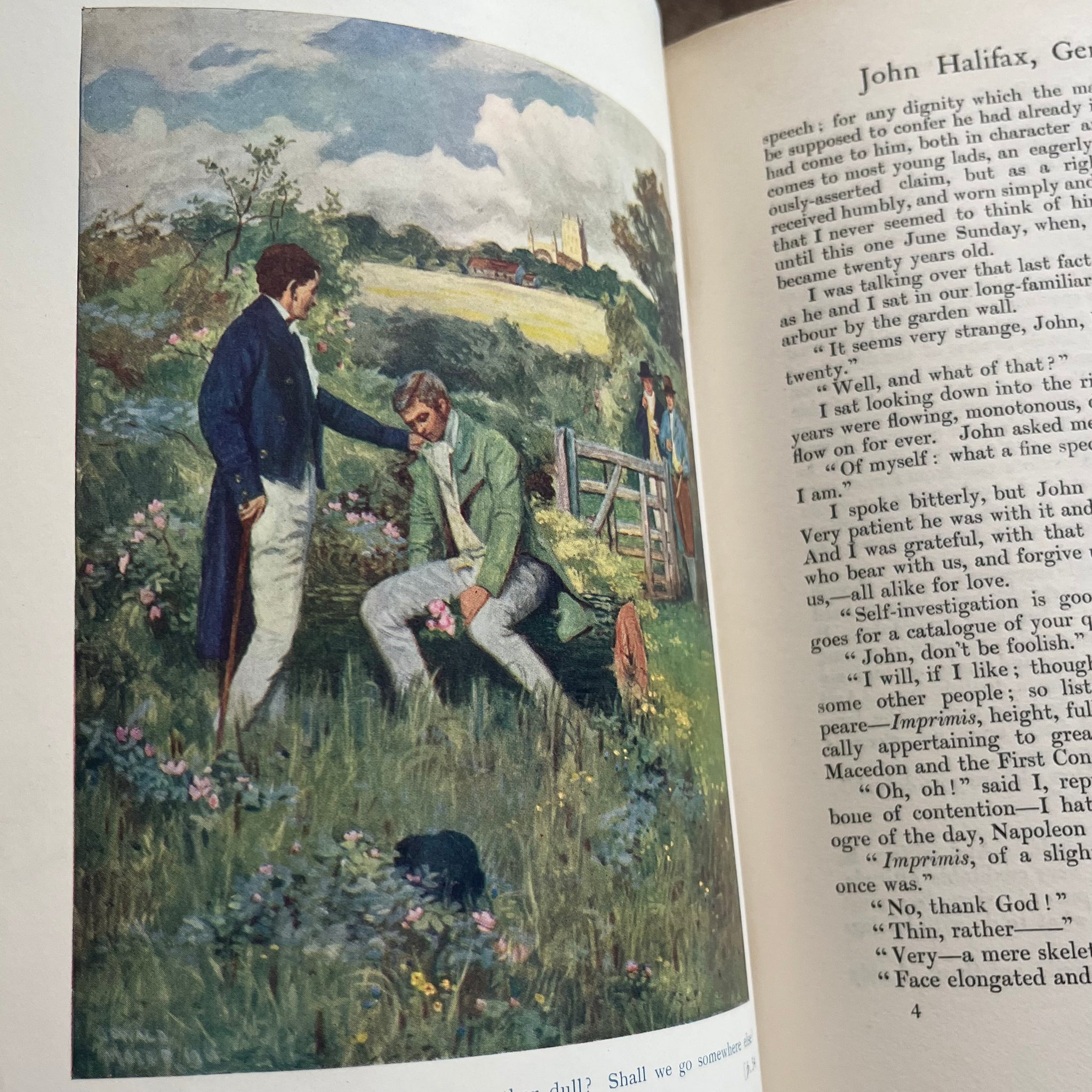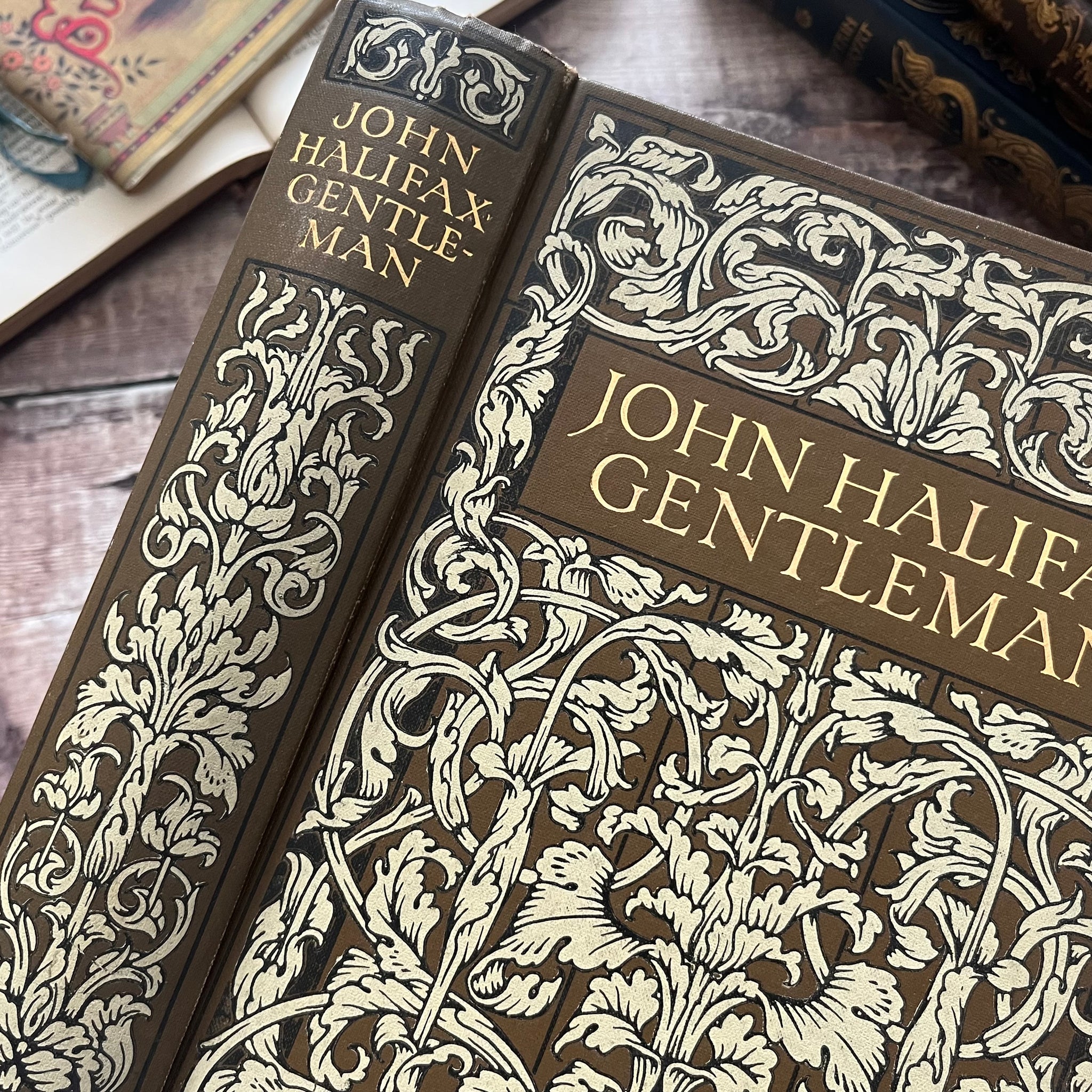 This antique hardback edition of John Halifax, Gentleman by Mrs Craik was published by Adam and Charles Black in 1912. It is bound in brown cloth with striking art nouveau detail to the front board and spine. The design was created by AA Turbayne, a very well known and respected book cover designer. His signature scarab beetle can be seen to the front board.