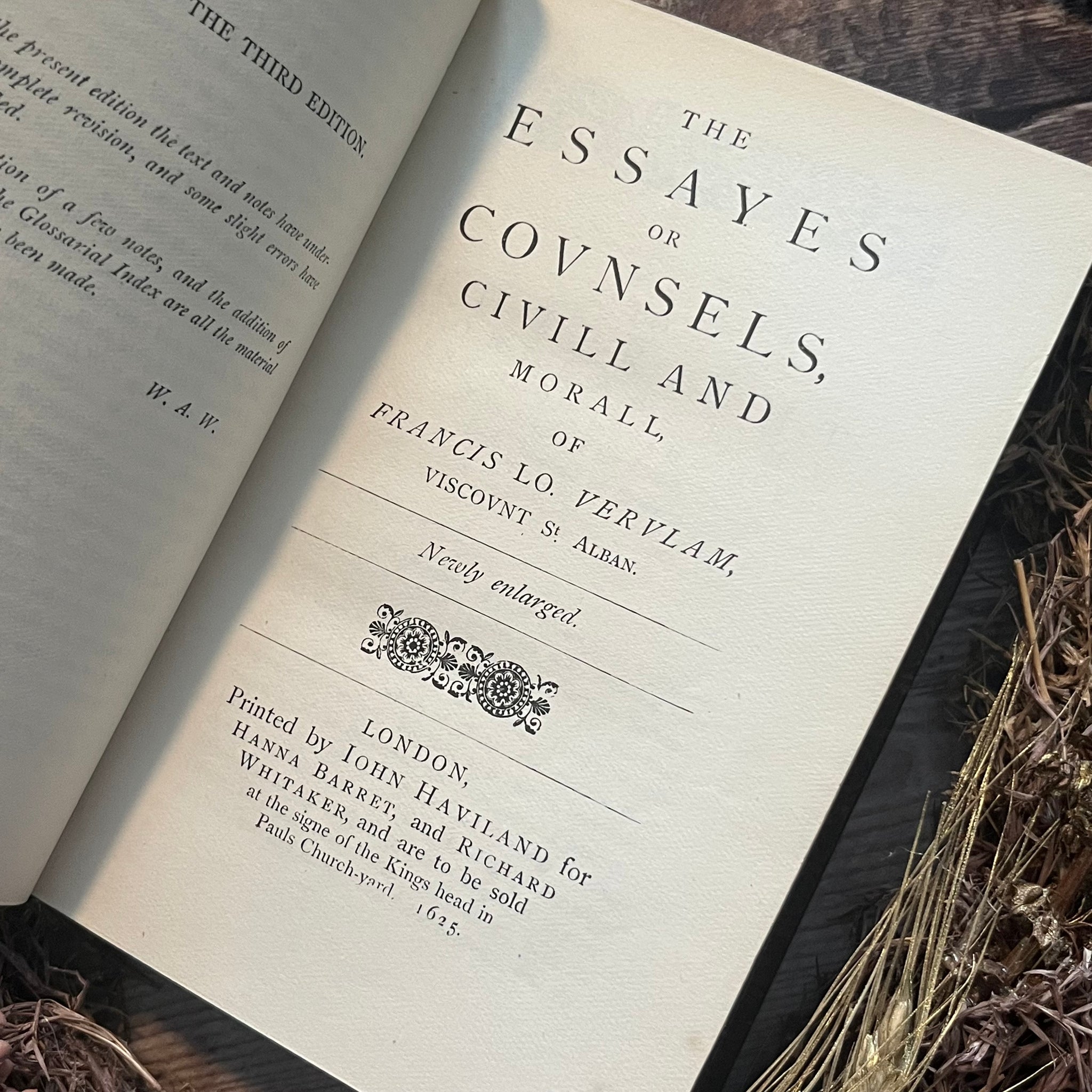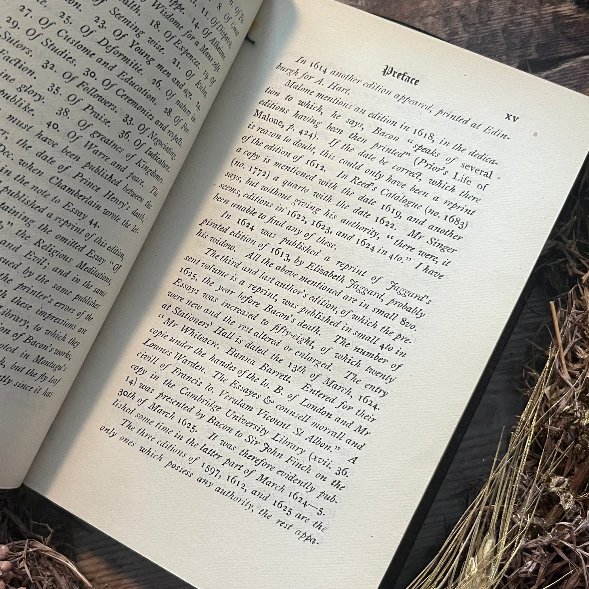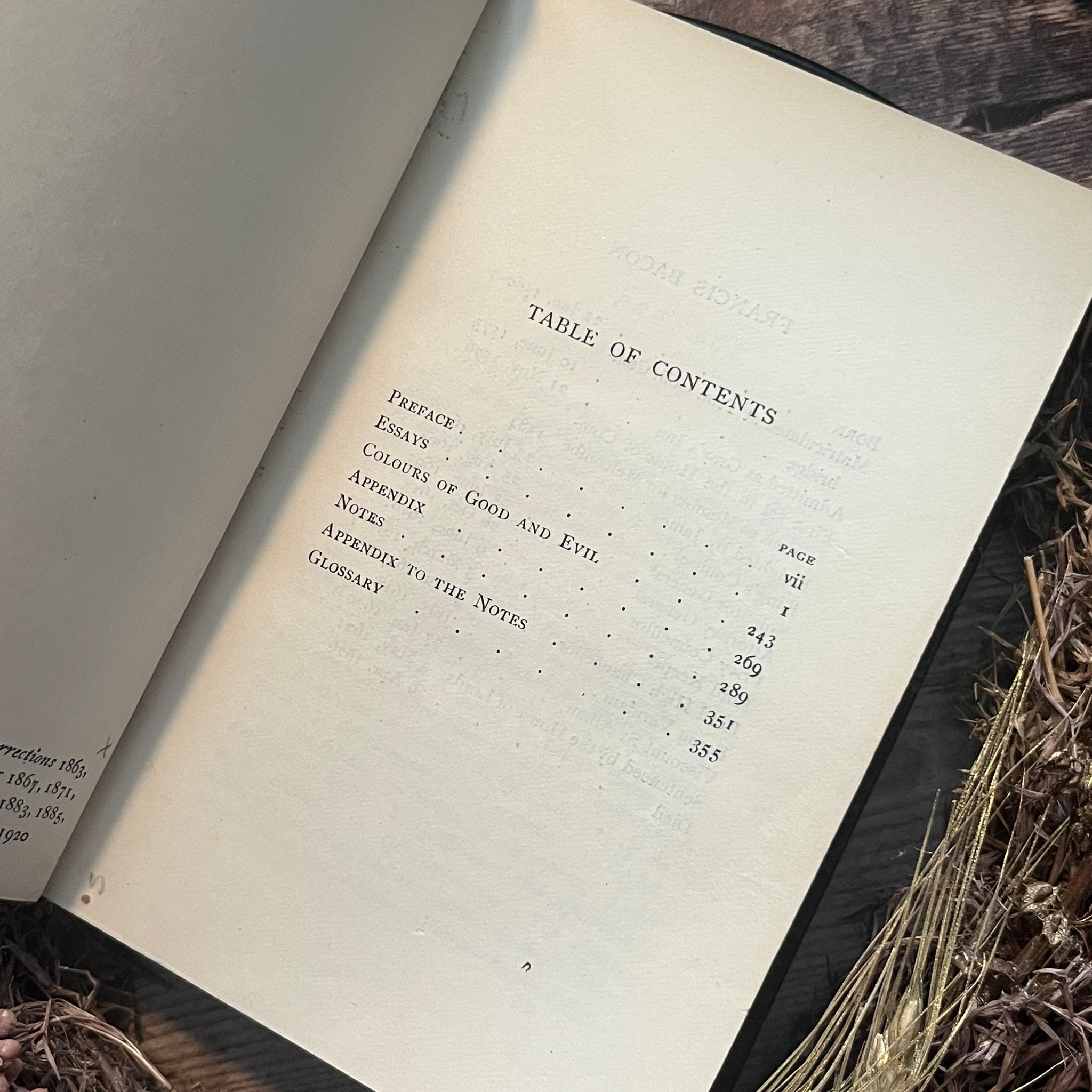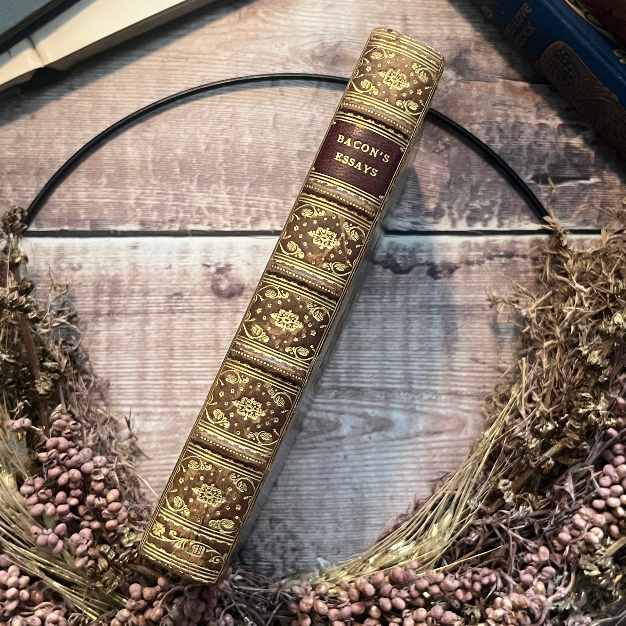 This lovely edition of Bacon's Essays and Colours of Good and Evil was published by London Macmillan and Co in 1920. It's a stunning school prize binding, bound in full tree calf leather, with marbling to the text block edges. There is a striking school insignia blind stamped into the front board in gilt - the two hippocampus' on either side of the coat of arms are particularly eye catching. The spine features five raised bands and gilt tooling.