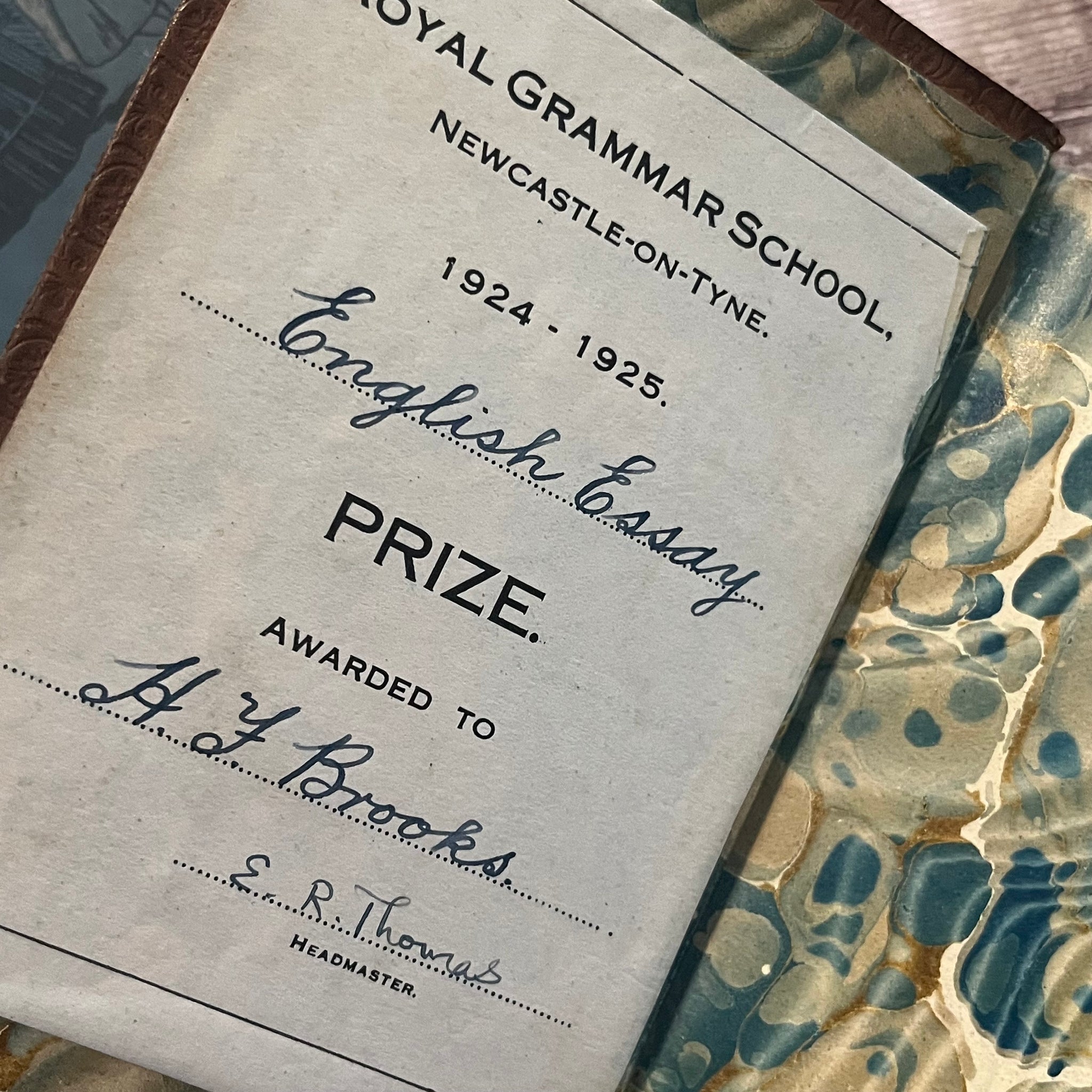 Inside, the endpapers are marbled to compliment the boards and there is a presentation plate glued to the front pastedown. The pages are clean and bright with only light age toning.
