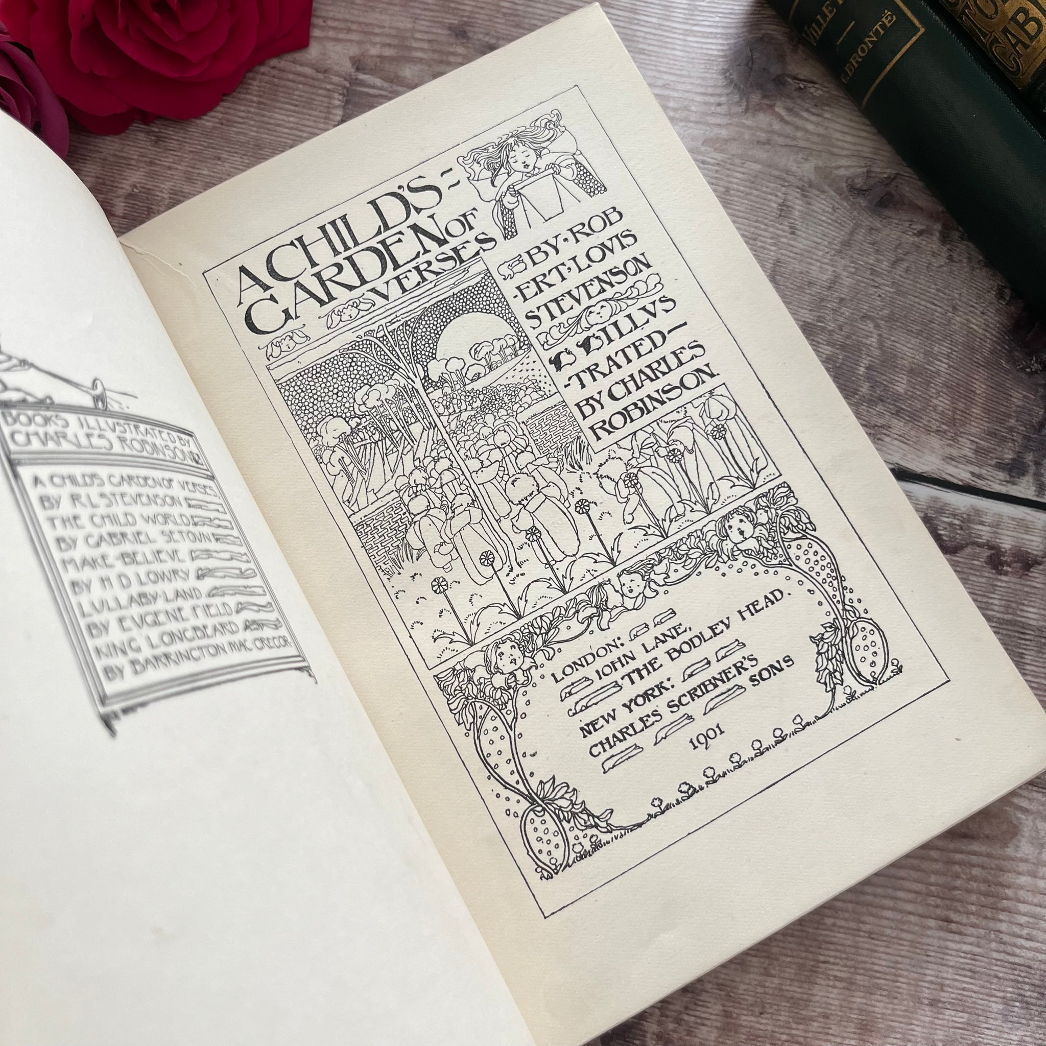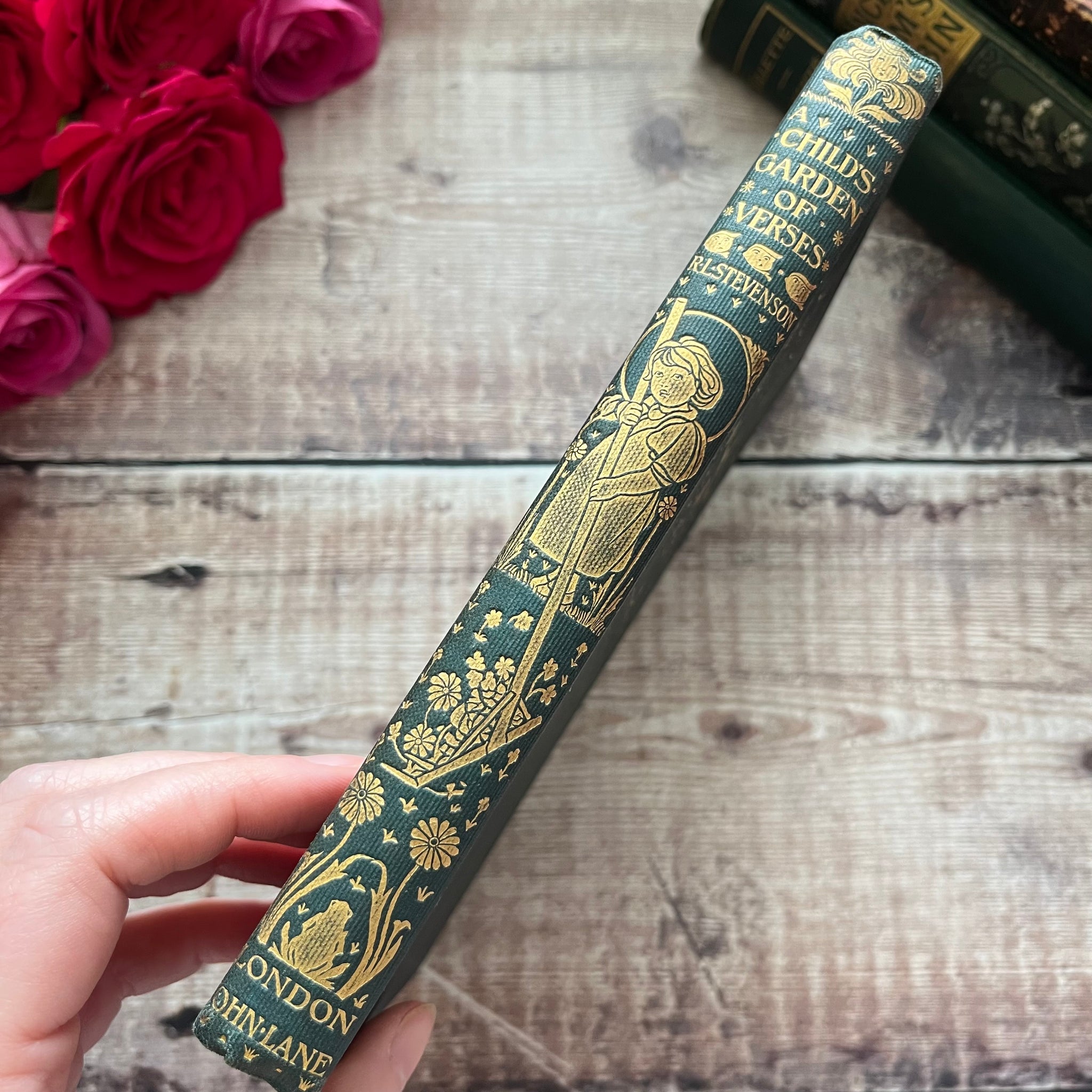 This striking edition of A Child's Garden of Verse by Robert Louis Stevenson was published by The Bodley Head in 1901. So the book is from the very end of the Victorian era. It is the sixth edition of this classic work by the author of Treasure Island.