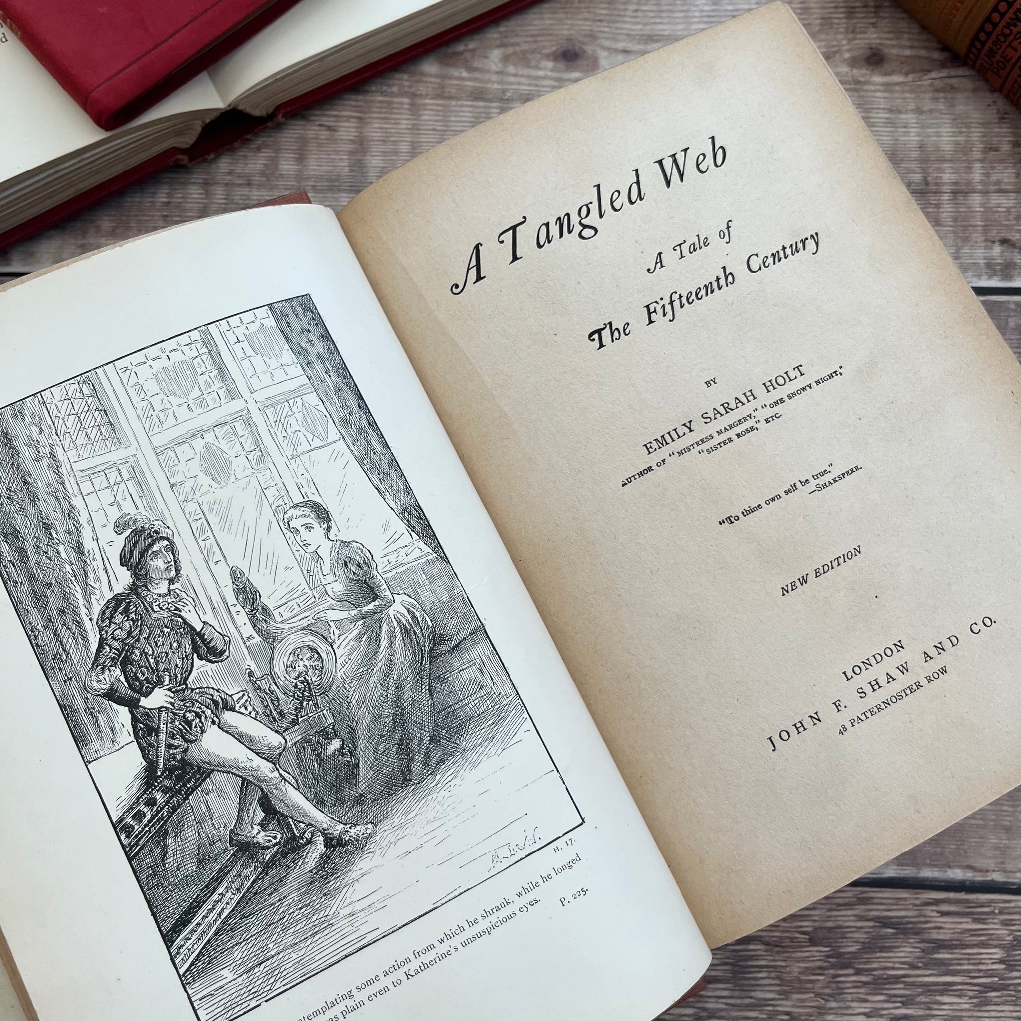 This beautiful antique edition of A Tangled Web A Tale of the 15th Century by Emily Sarah Holt was published by John F Shaw. The book itself is undated but there is a presentation plate dated 1904. So the book is likely to be from the Edwardian era.