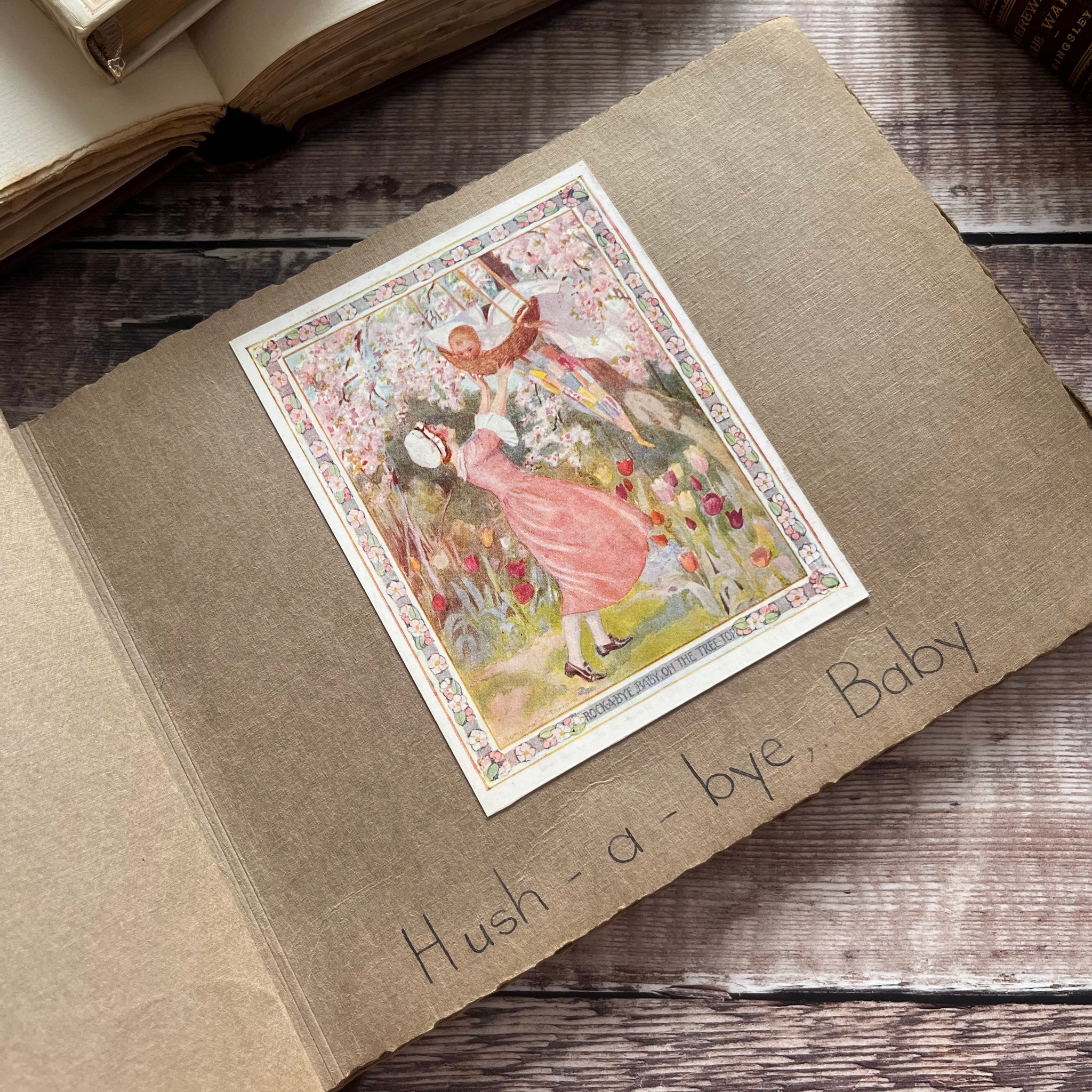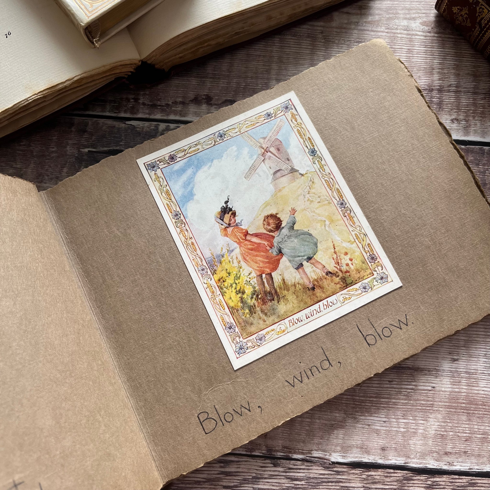 This quaint little scrapbook has been put together by a child. They call it their nursery rhyme book but really it only has the names of nursery rhymes with accompanying stuck in illustrations.