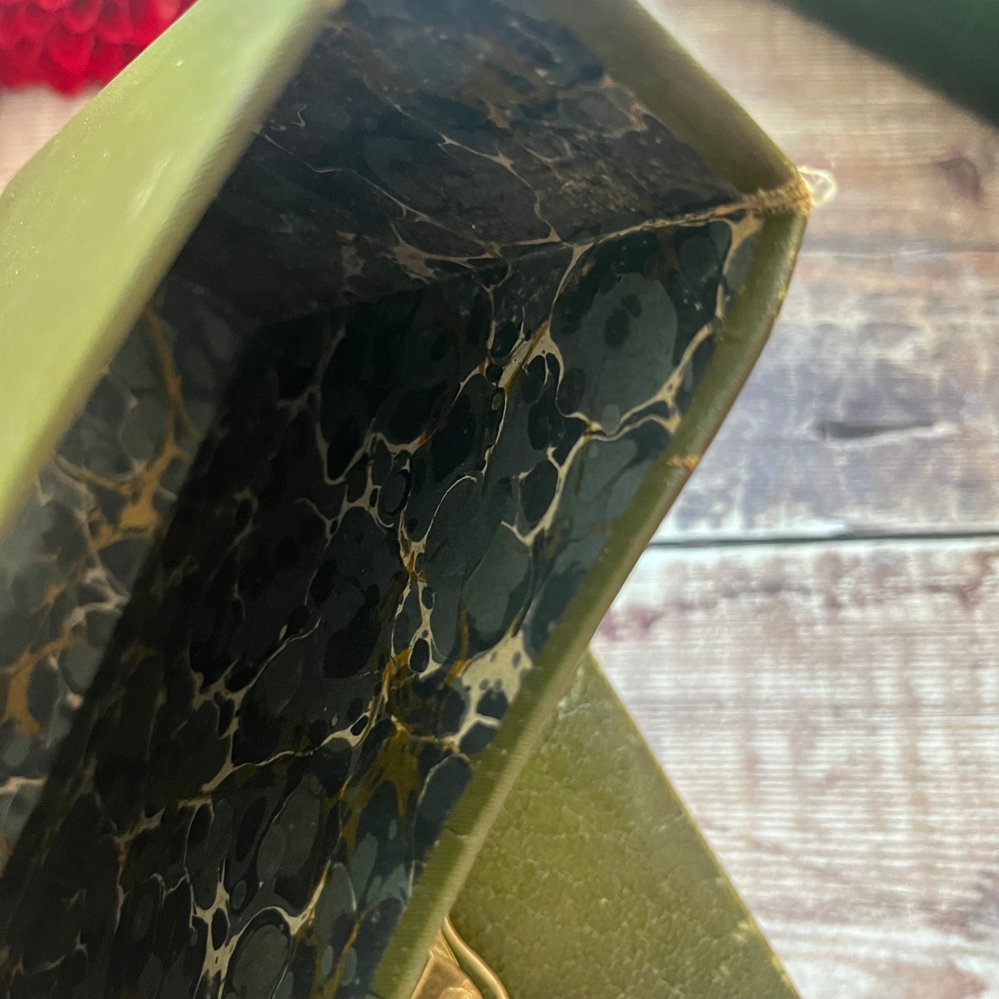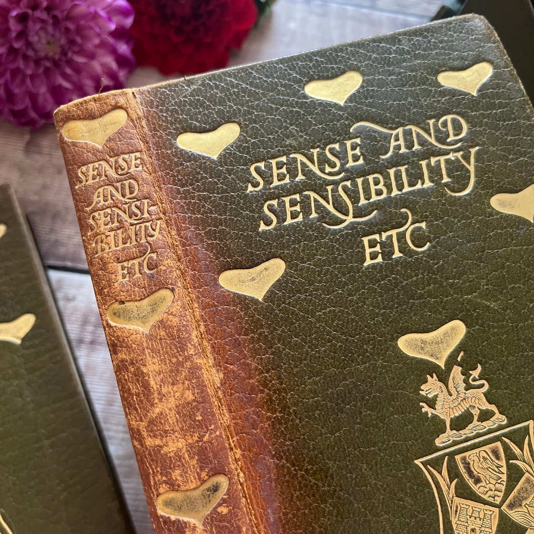 The books are uniformly bound in olive green leather with gold gilt decoration to the front boards and spines. The heart motif is quite rare in books of this age, and I've only seen these Austen editions once before. There is also a school insignia blind stamped in gold gilt to the front boards. The books have their own slipcase, which is lined with marbled paper inside.