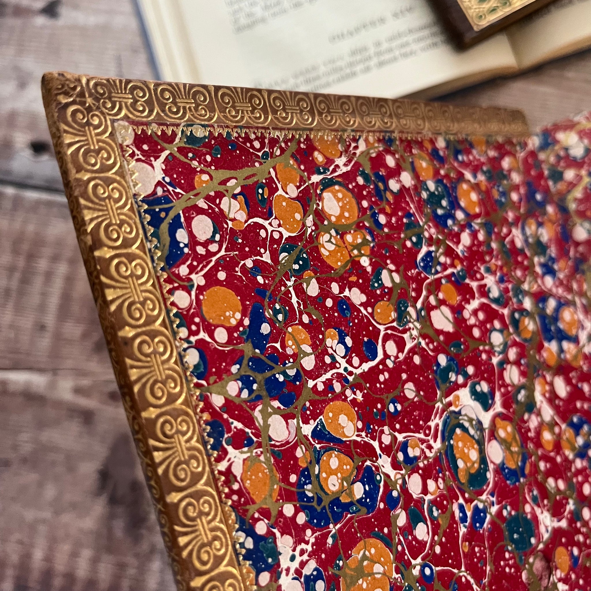 Inside, the endpapers are beautifully marbled and there are gilt inner dentelles. The pages are clean and bright with only light age toning and occasional foxing. There is a written inscription on one of the preliminary blank pages.