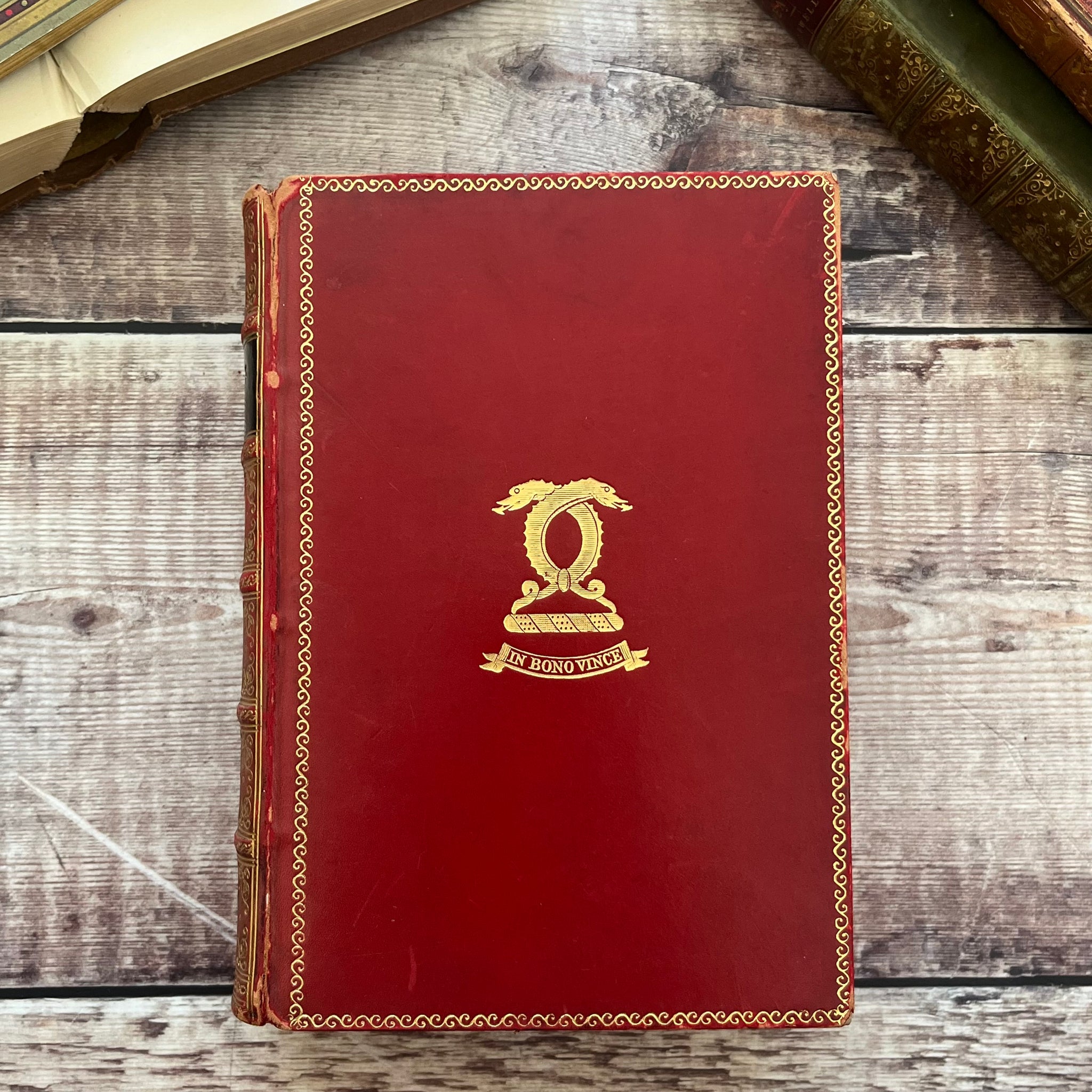 Inside, the endpapers are marbled to match the edge of the text block and there is a presentation plate glued to the front pastedown. The pages show light age toning and very occasional foxing but are otherwise in very good, antique condition.