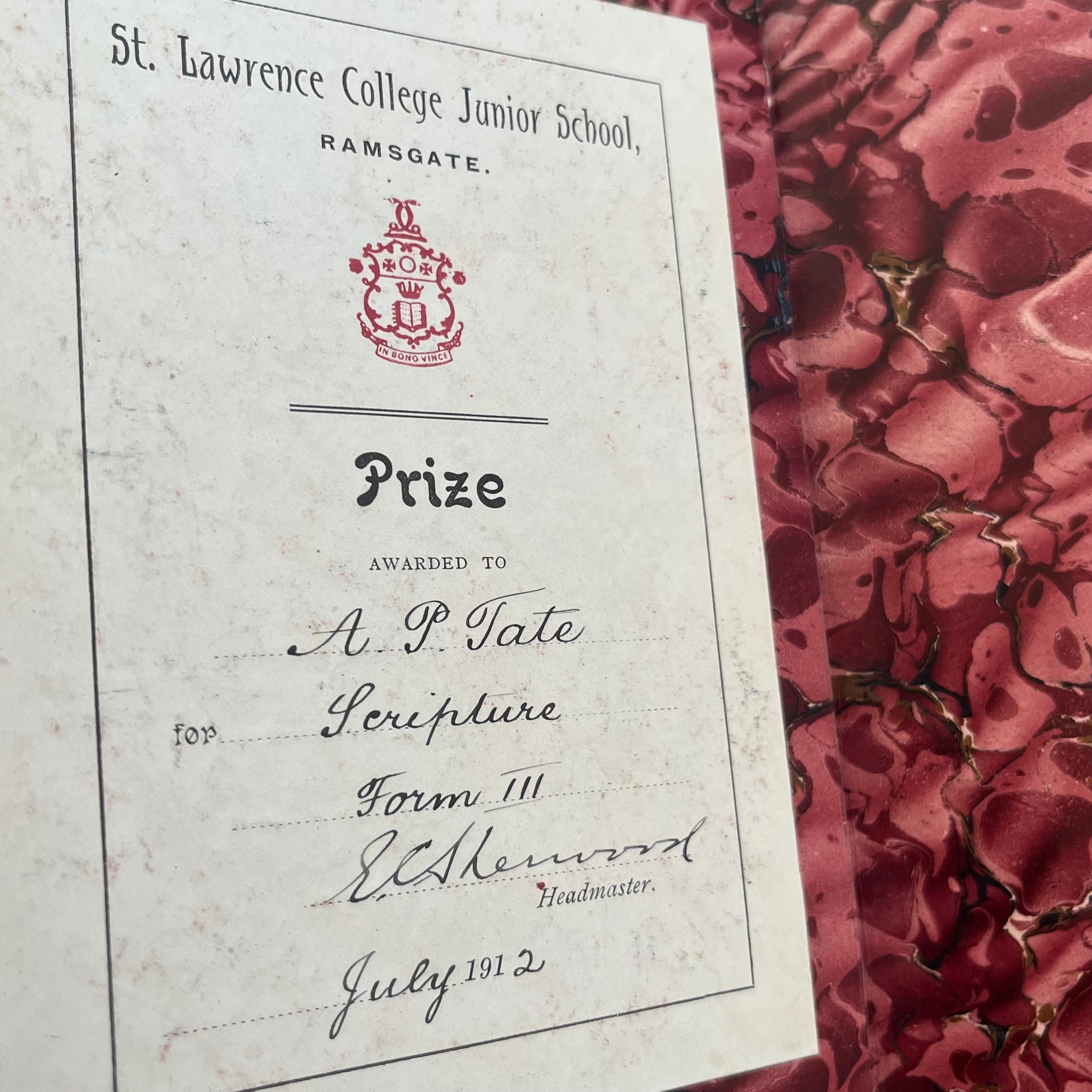 The book is bound in full calf leather with five raised bands to the spine and gilt decoration. The text block edges are marbled and there is a blind stamped school insignia in gilt to the front board.