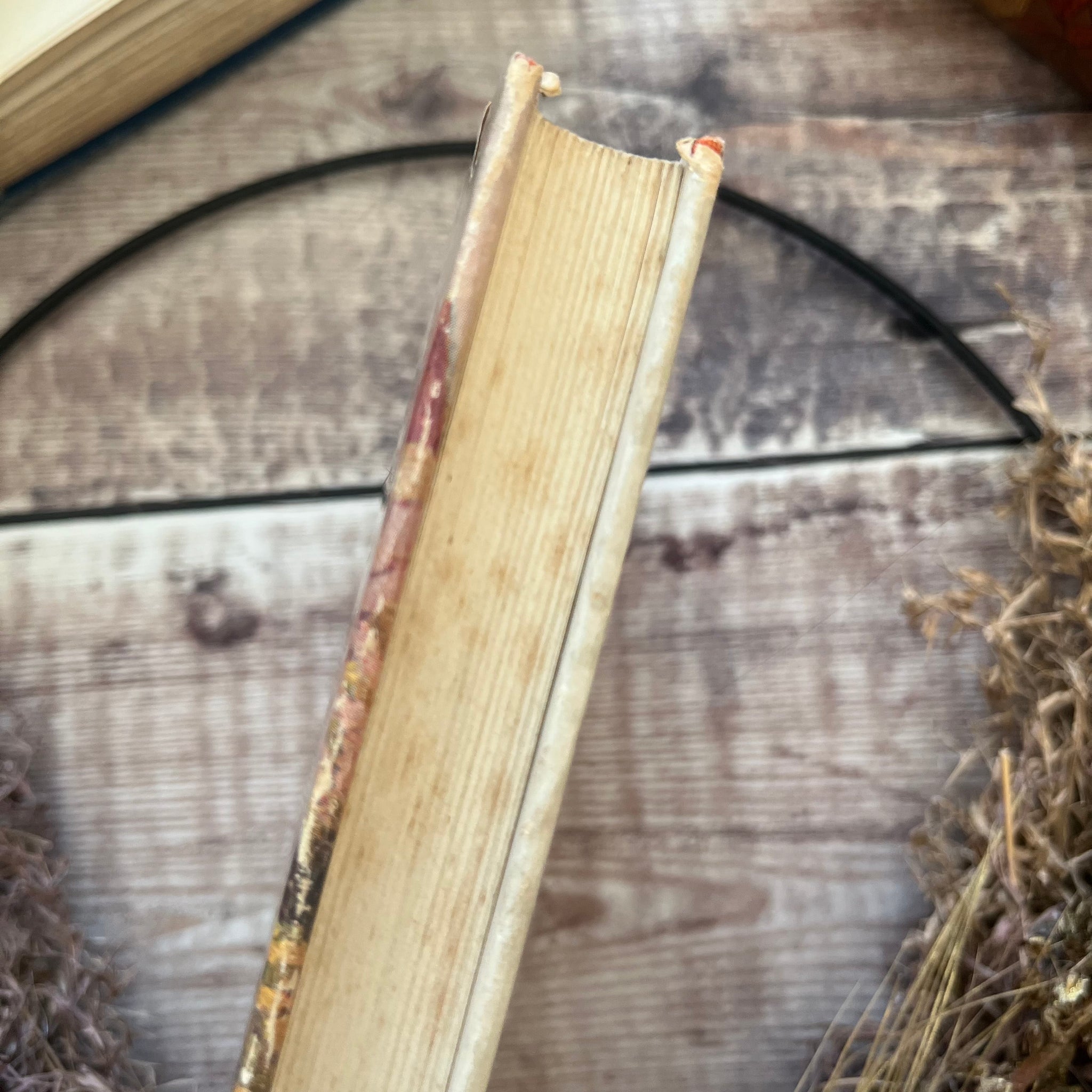 The book is bound in orange cloth with lettering to the front and spine. It's in very good condition. There is a small area of fading to the spine where a piece of the DJ is missing. The text block edges show foxing and there is some wear and tear to the edges of the DJ. The paper DJ shows some soiling and foxing.