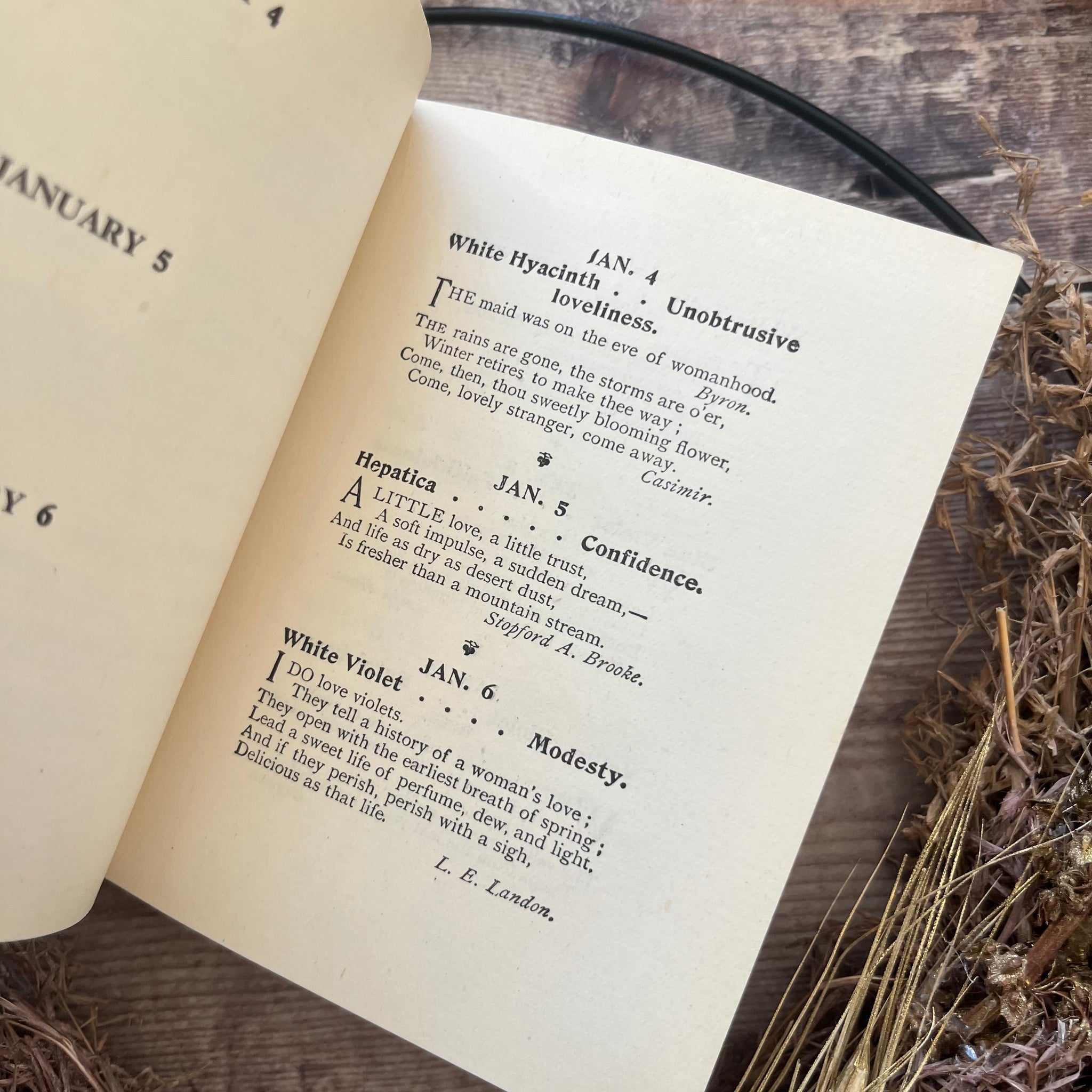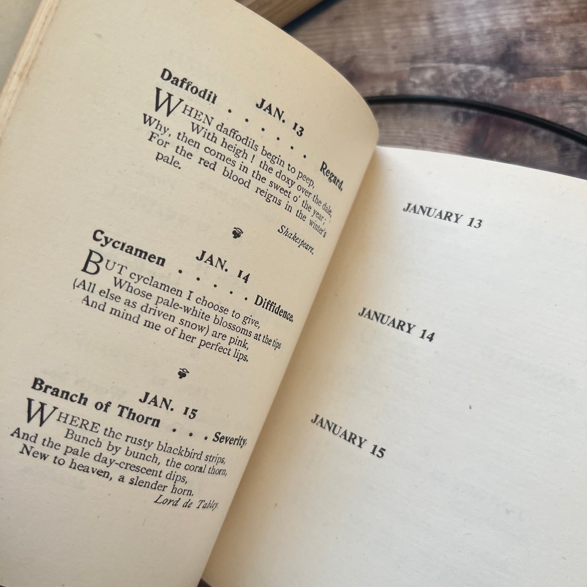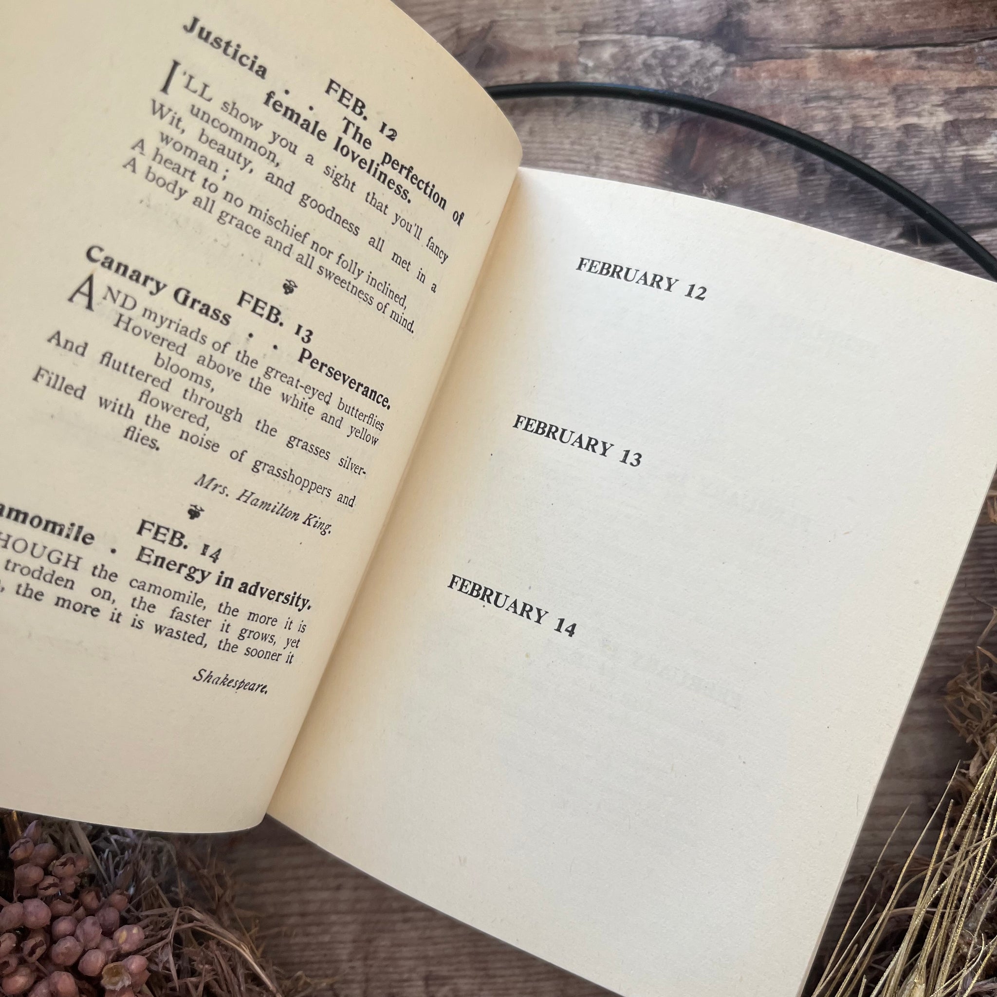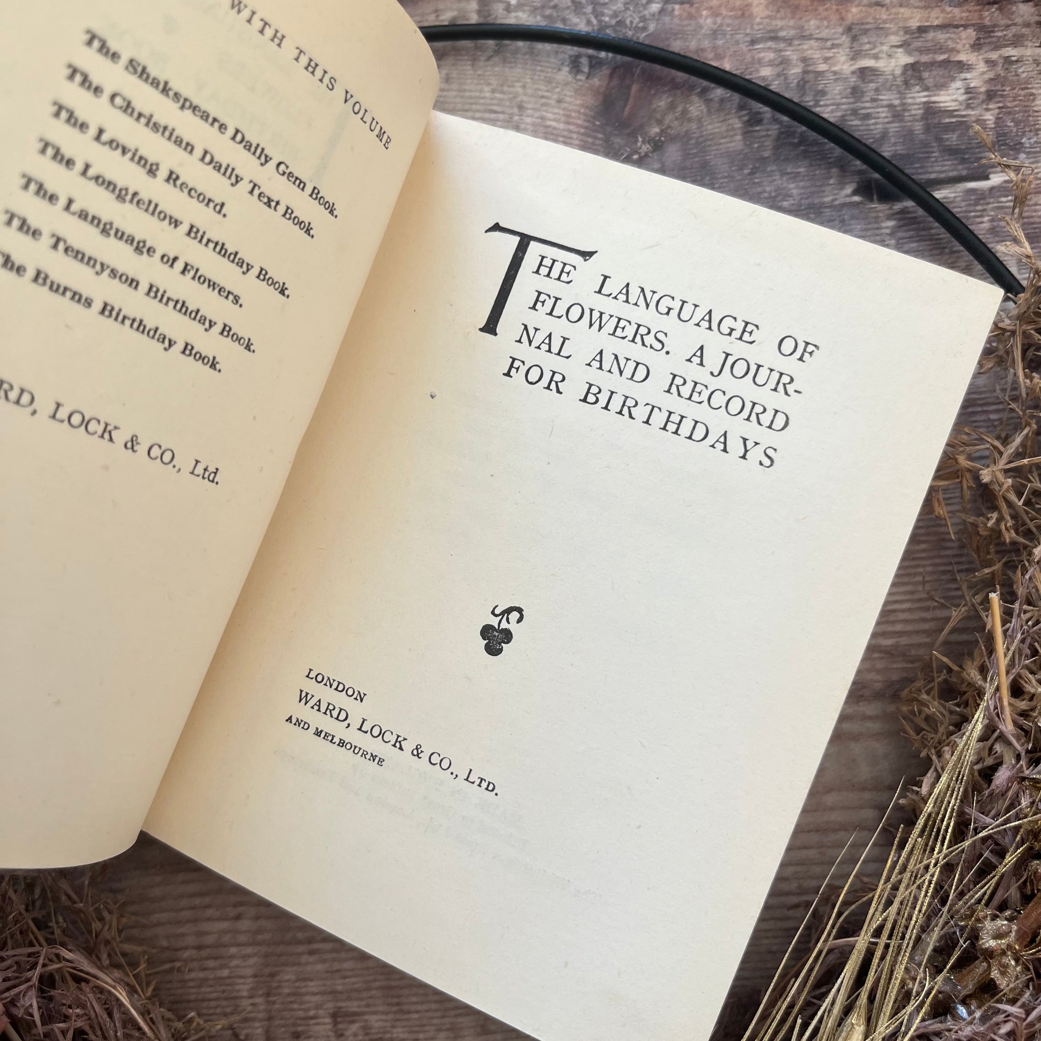 This beautiful vintage edition of The Language of Flowers contains A Journal and Record of Birthdays that the owner can fill in. Each date has space to write a few names. Each date is also assigned a flower with it's meaning, and a short sentence of verse. It was published by Ward, Lock and Co. The book is undated but I'd estimate it to be from circa 1950's.