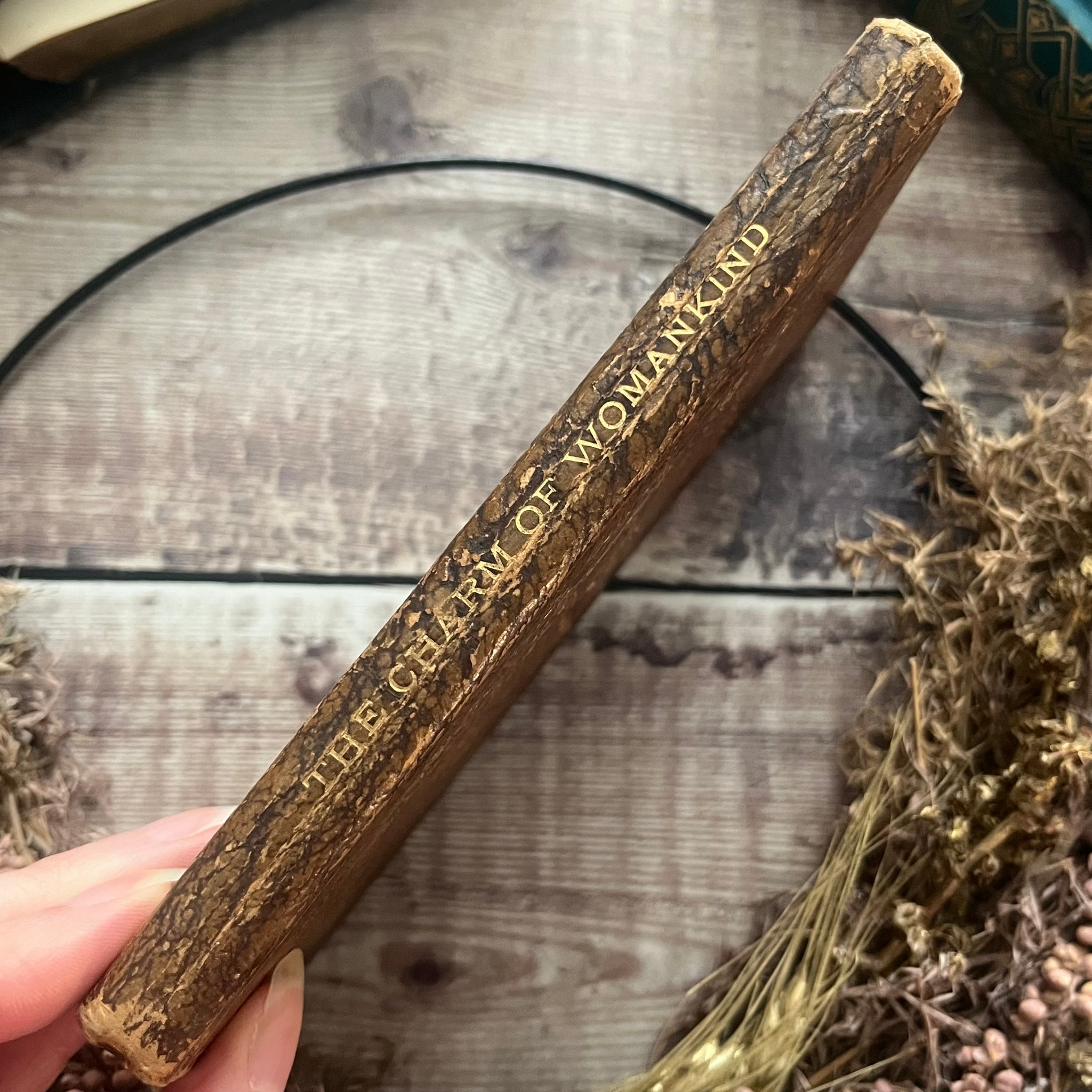 This sweet little edition of The Charm of Womankind features An Anthology of Verse. It was published in 1909 by Peacock, Mansfield and Co. It features a faux leather binding with beautiful gilt in an art nouveau design to the front board.