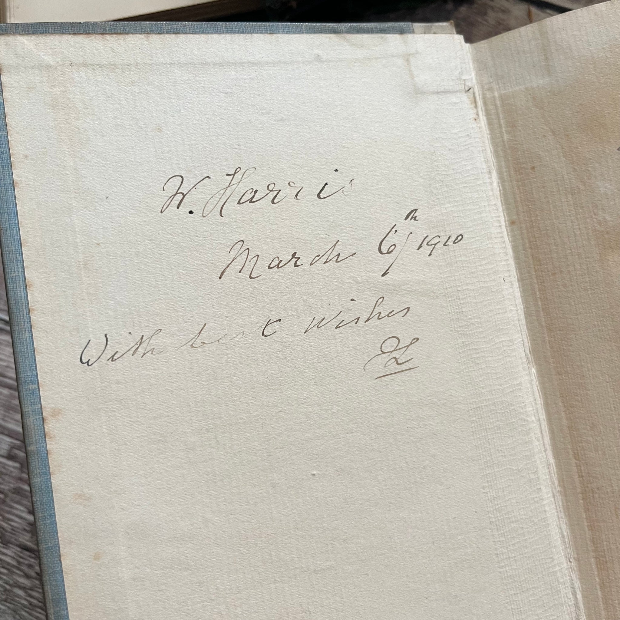 Inside, the endpapers are tanned and there is a written inscription on the front pastedown, alongside a name written in pencil on the front free endpaper. The rest of the pages show light age toning.
