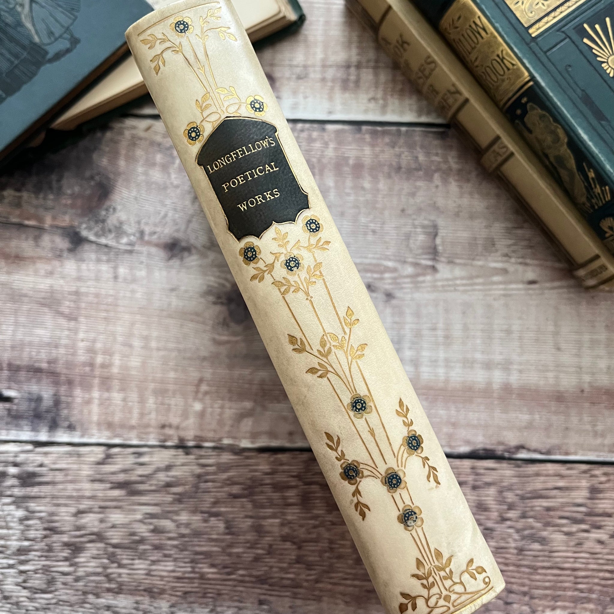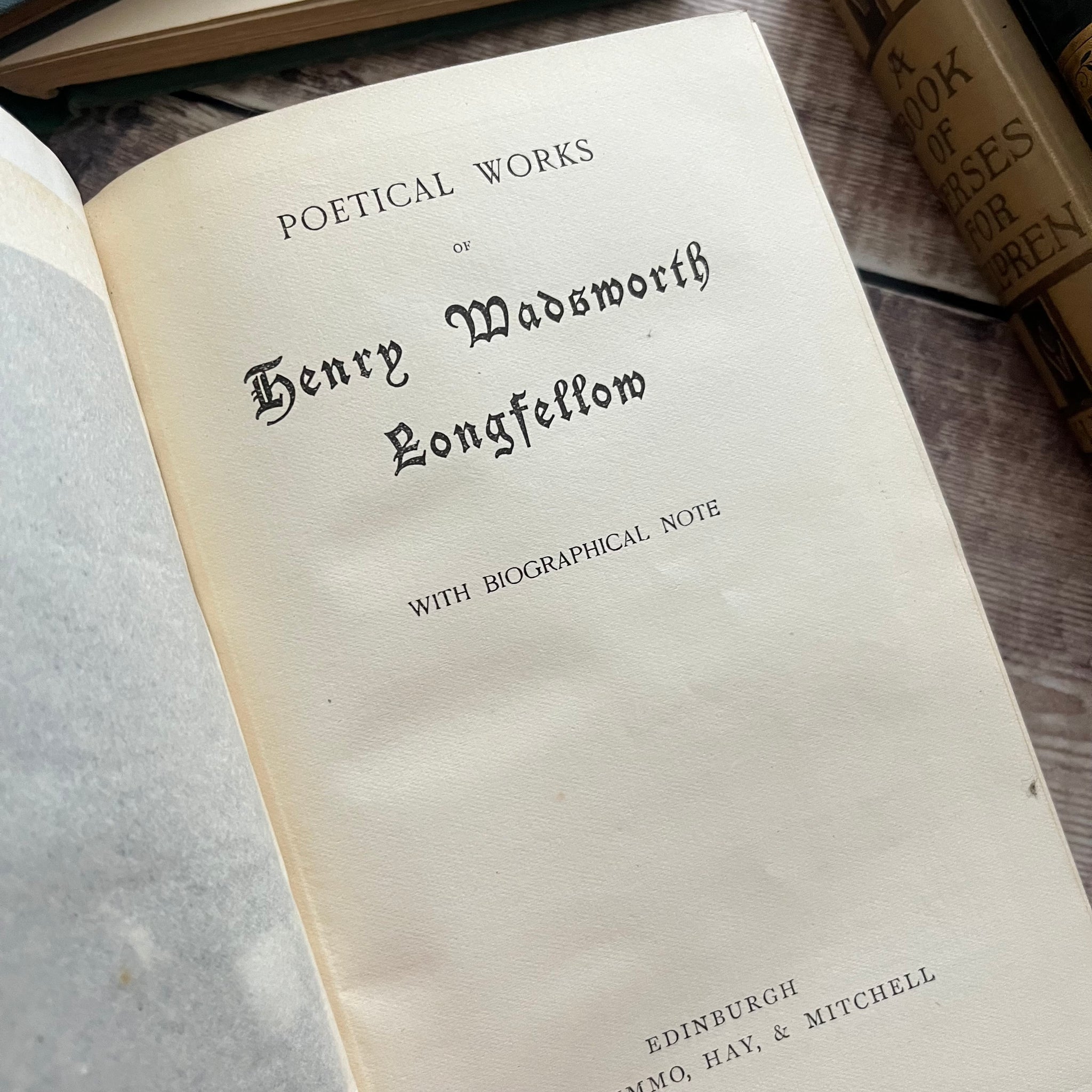 This beautiful, antique edition of the The Poetical Works of Longfellow was published by Nimmo, Hay and Mitchell. The book itself is undated but there is a written inscription inside dated 1910.