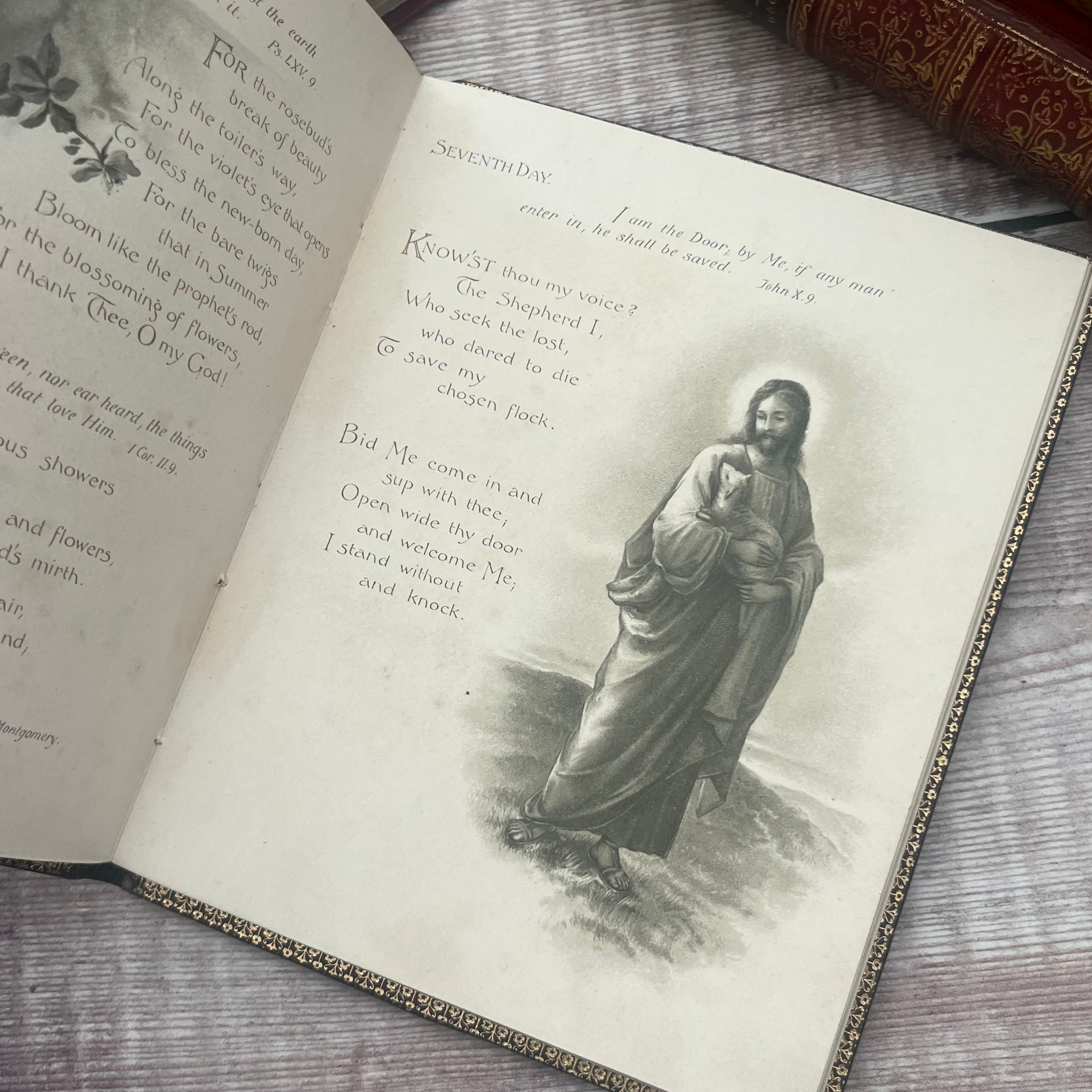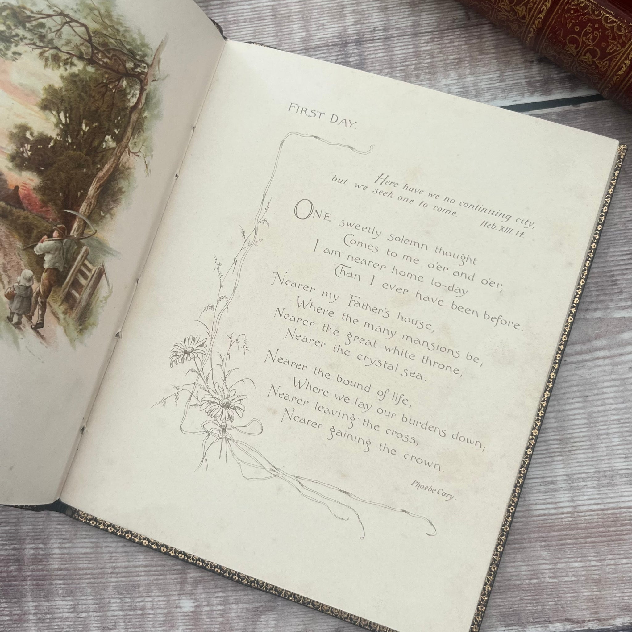 This stunning antique edition of Homeward A Scripture Text Book for Every Day of the Month was published by Castell Brothers. The book features a full leather binding with stunning gilt to the front cover and gilt inner dentelles. All edges gilt.