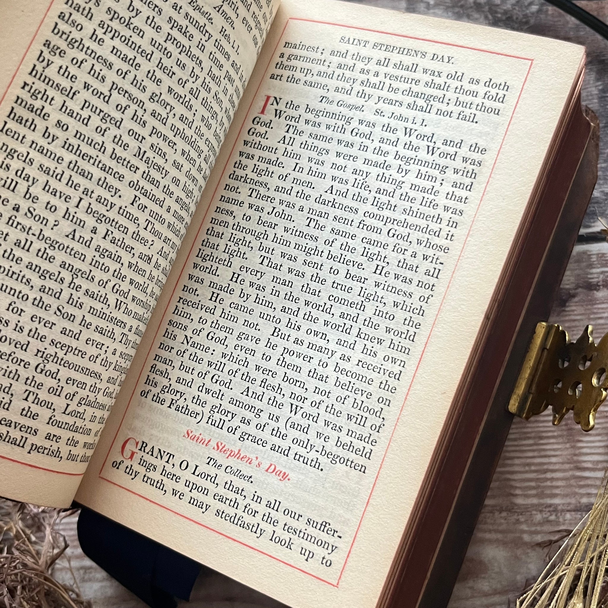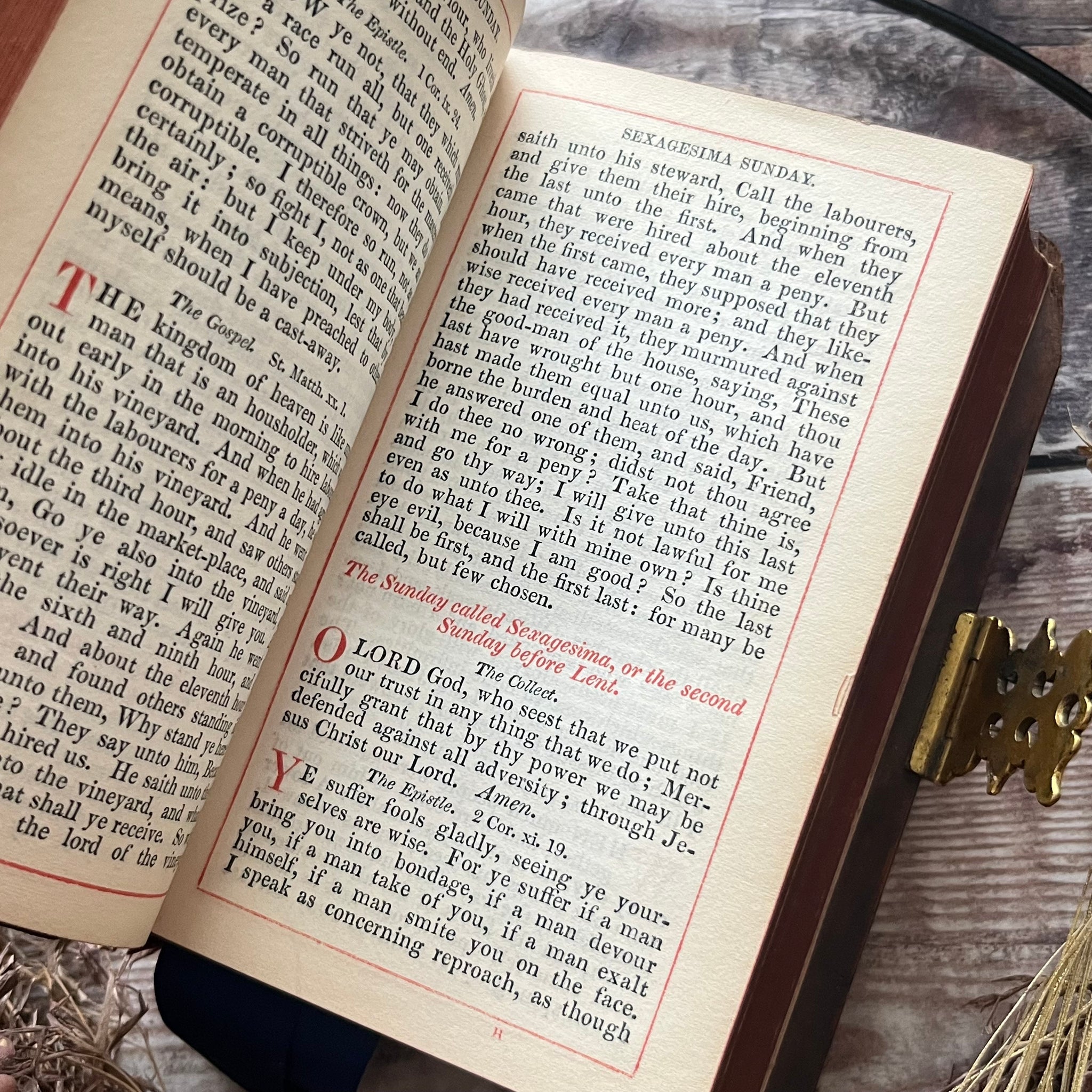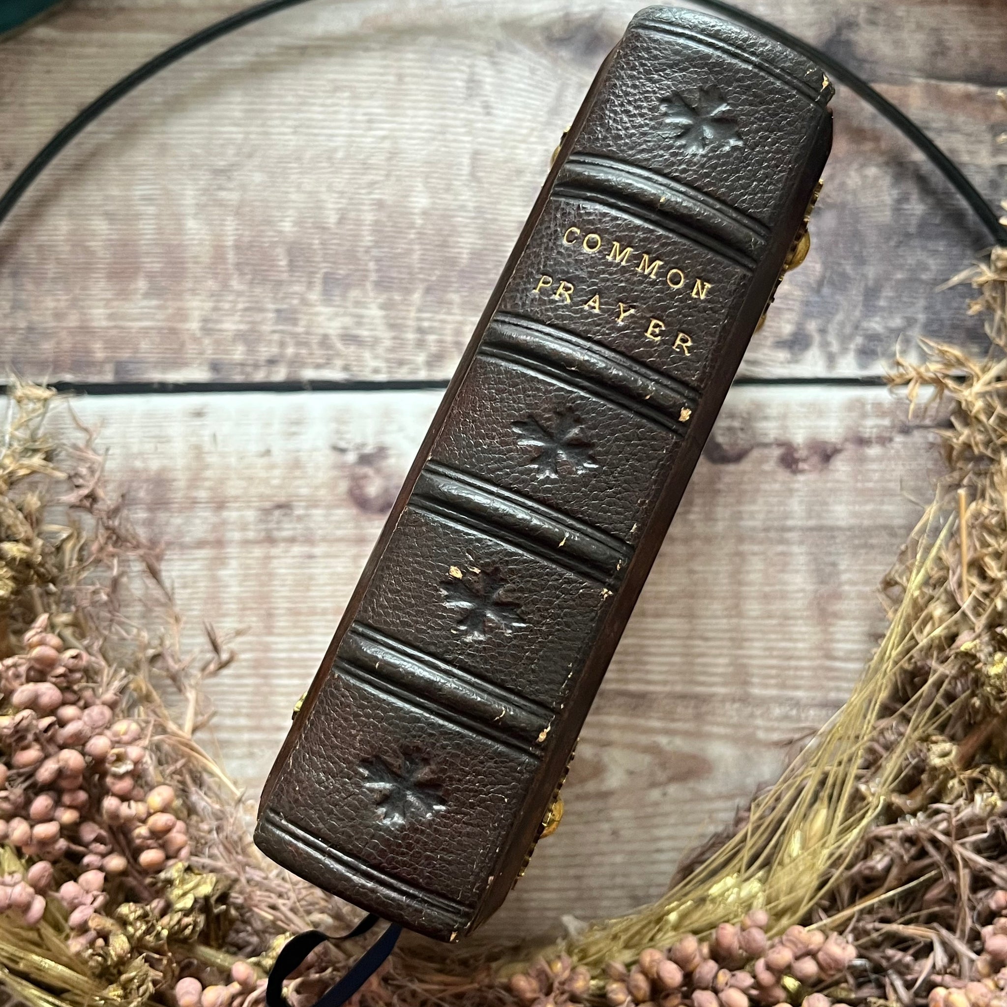 This stunning early Victorian edition of The Book of Common Prayer features a leather spine and polished wood boards with brass decorations and clasp. It was published in 1854 by Oxford University Press. All edges are gilt.