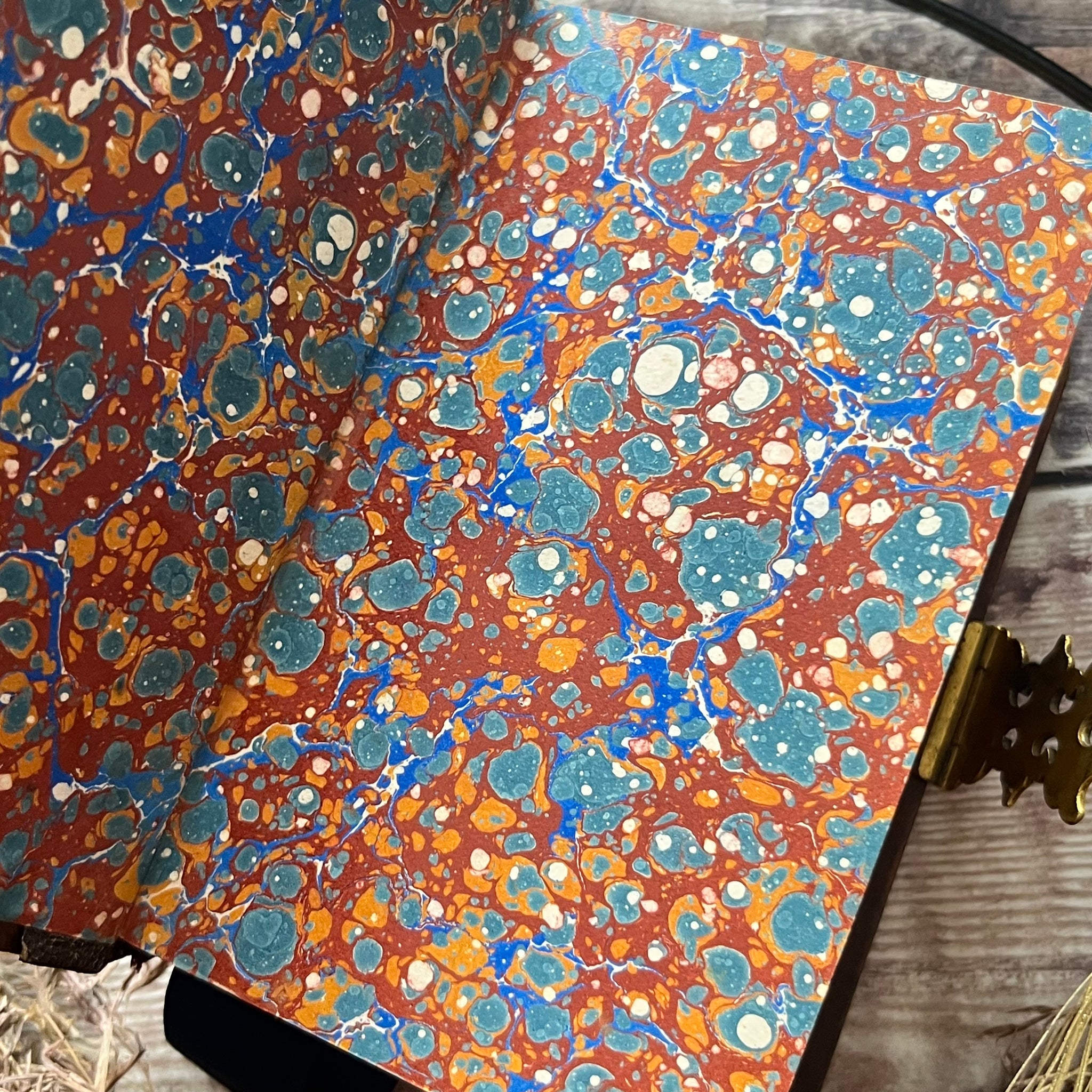 Inside, the endpapers are marbled and the pages remain tightly bound. When the text block is fanned out, you can see the original red edges under the gilt. The pages show some age toning, with only occasional foxing. There is a signature to one of the preliminary blank pages - “Mary Dorothea Gibbs 1856”.
