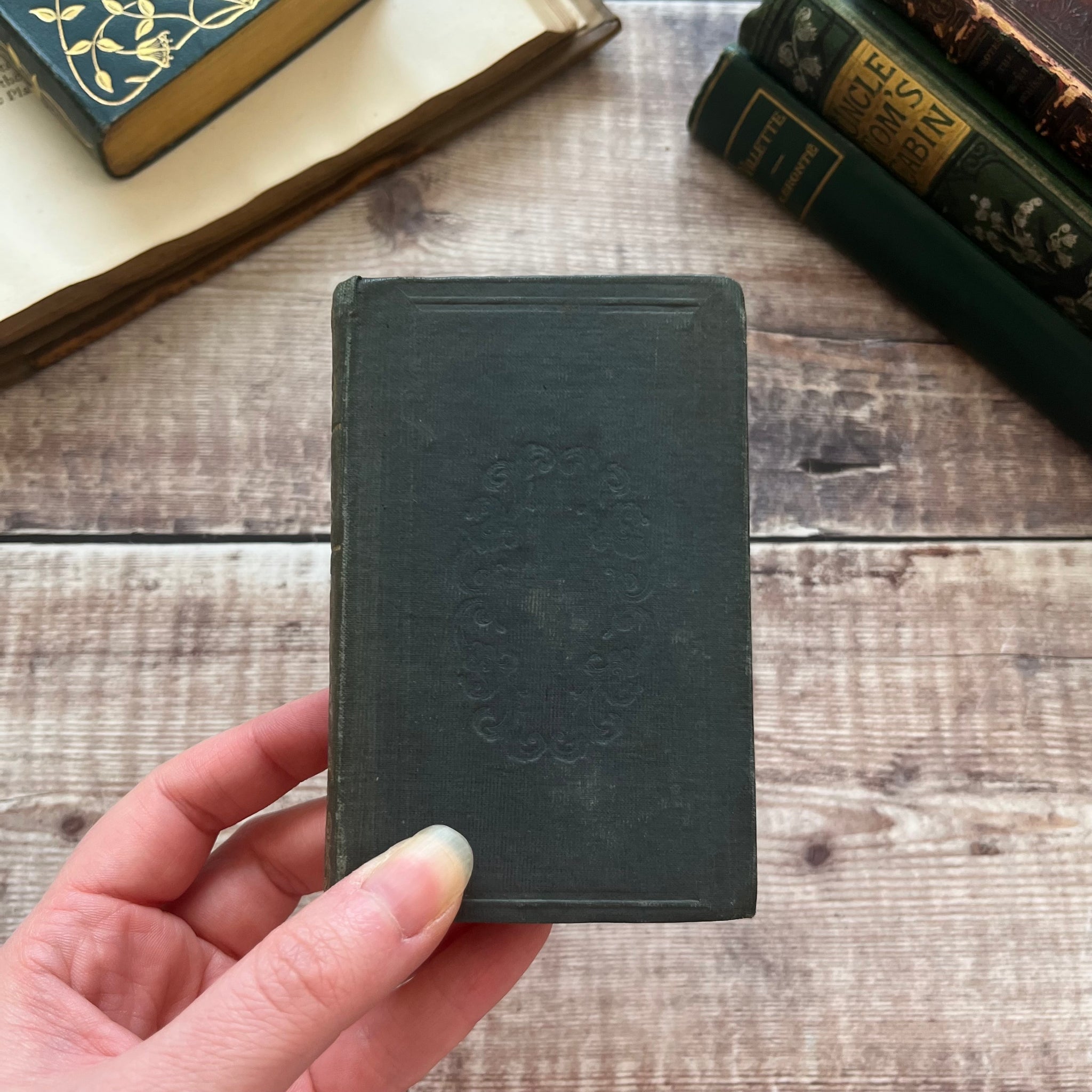 The little book is bound in deep blue grey cloth with blind stamped detail to the boards and gold gilt to the spine. It's in remarkably good condition seeing as this is the original binding. There is light wear and crushing to the corners, and bumping to the board edges. The boards show faint marks and discolouration, but the spine is more noticeably sunned. There is crushing to the spine ends.