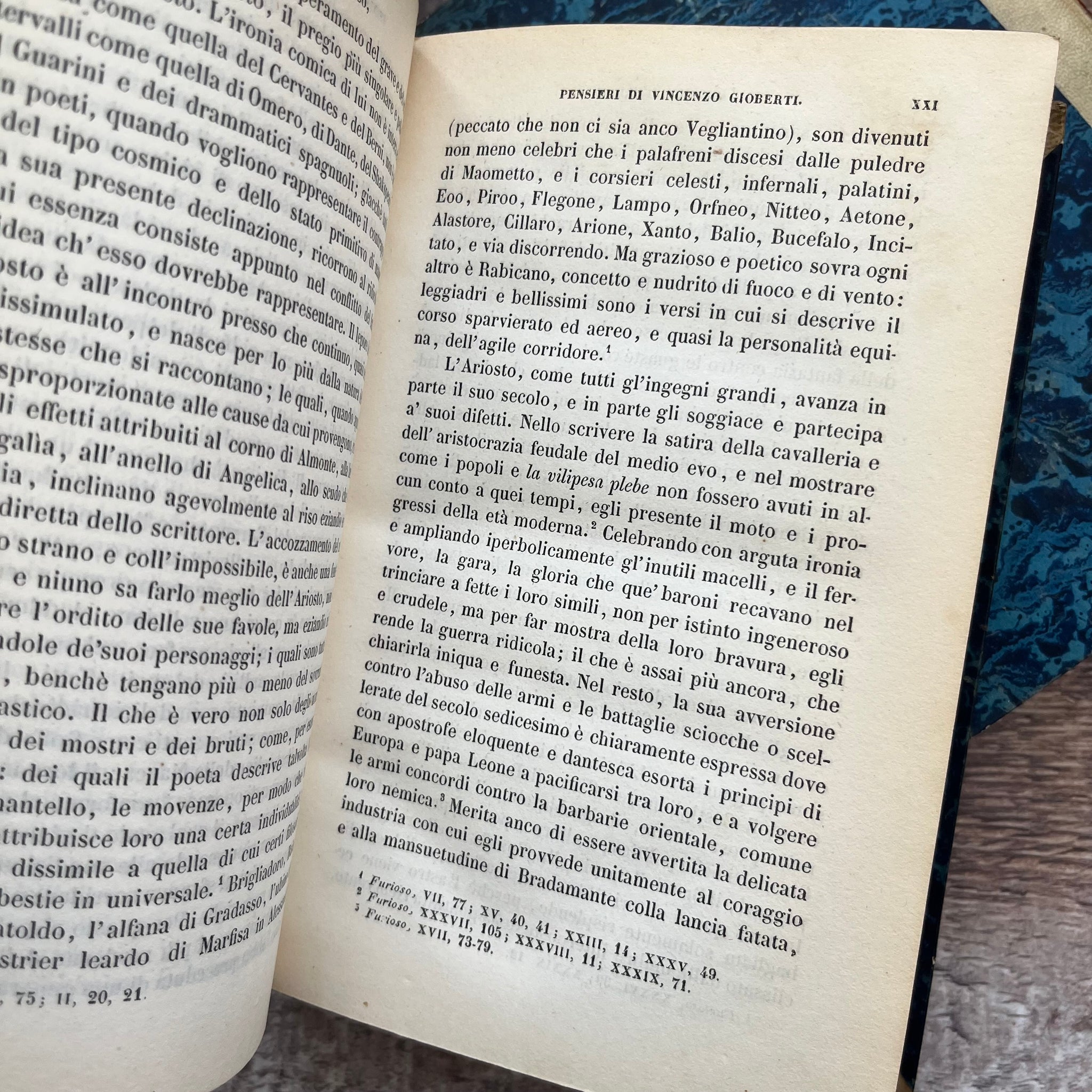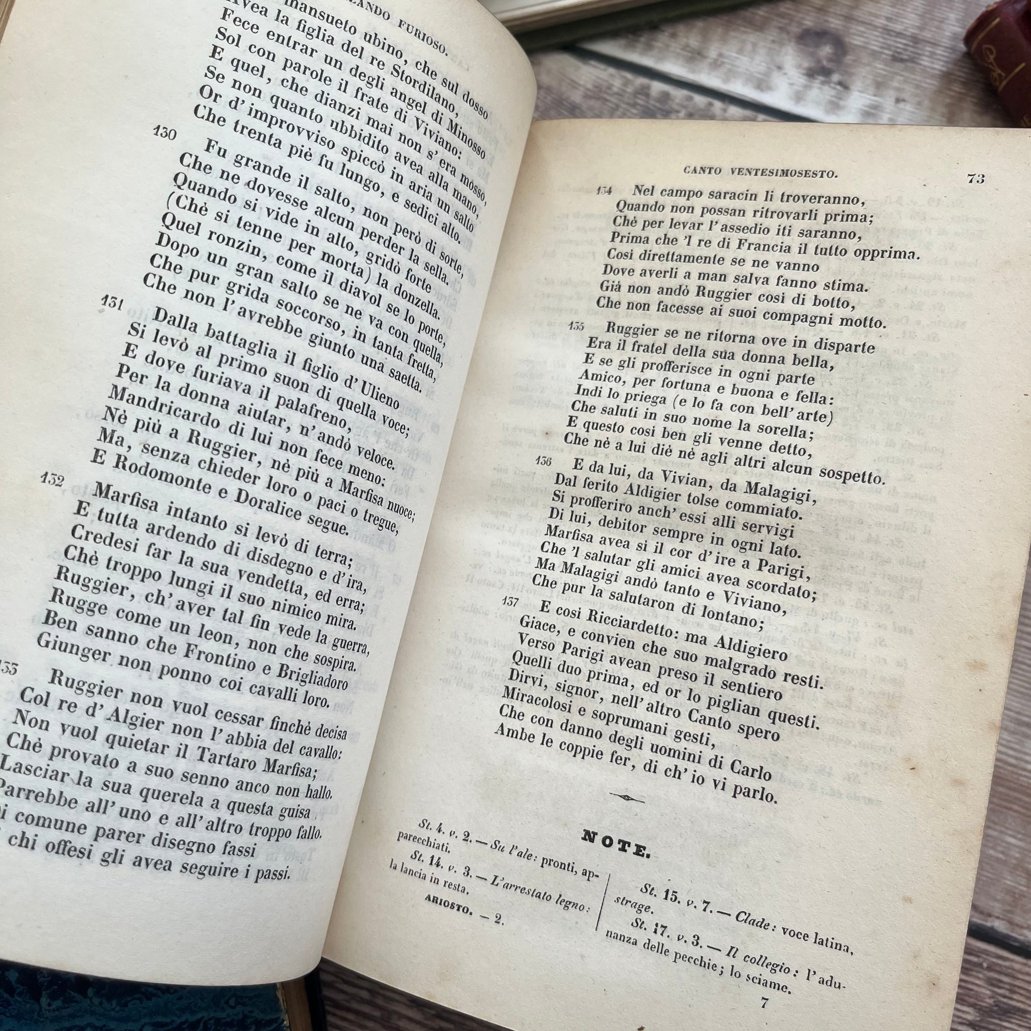 These beautiful antique Italian books feature the epic poem Orlando Furioso written by Ludovico Ariosto. The earliest version appeared in the 1500's which makes this 1846 two volume edition seem very young!
